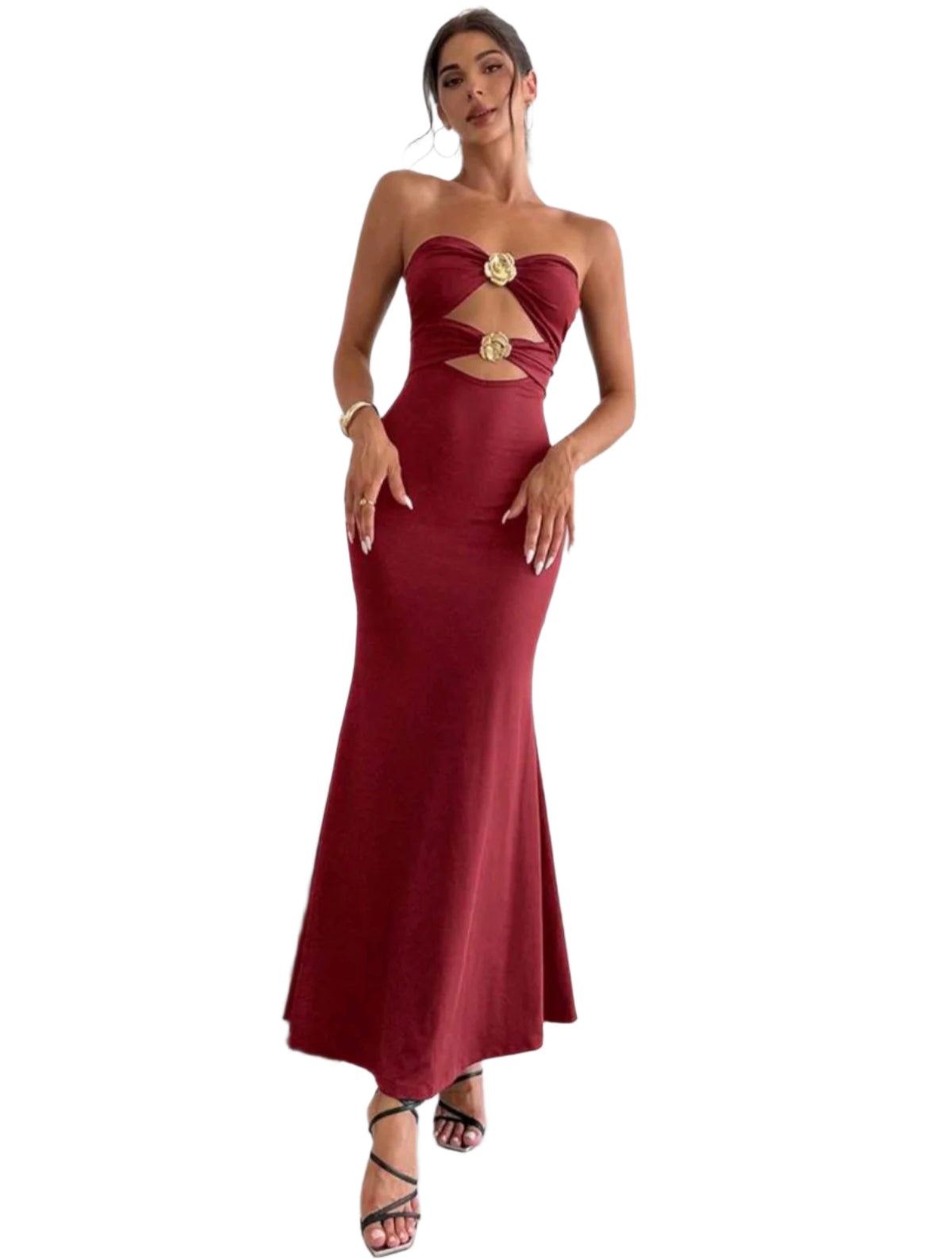 Címke nélküli, bordó színű, testhezálló maxi ruha pánt nélküli kialakítással. A mellrészen és a derékrészen arany díszítésű kivágások teszik különlegessé. Elegáns és merész választás alkalmi eseményekre vagy esti megjelenéshez.