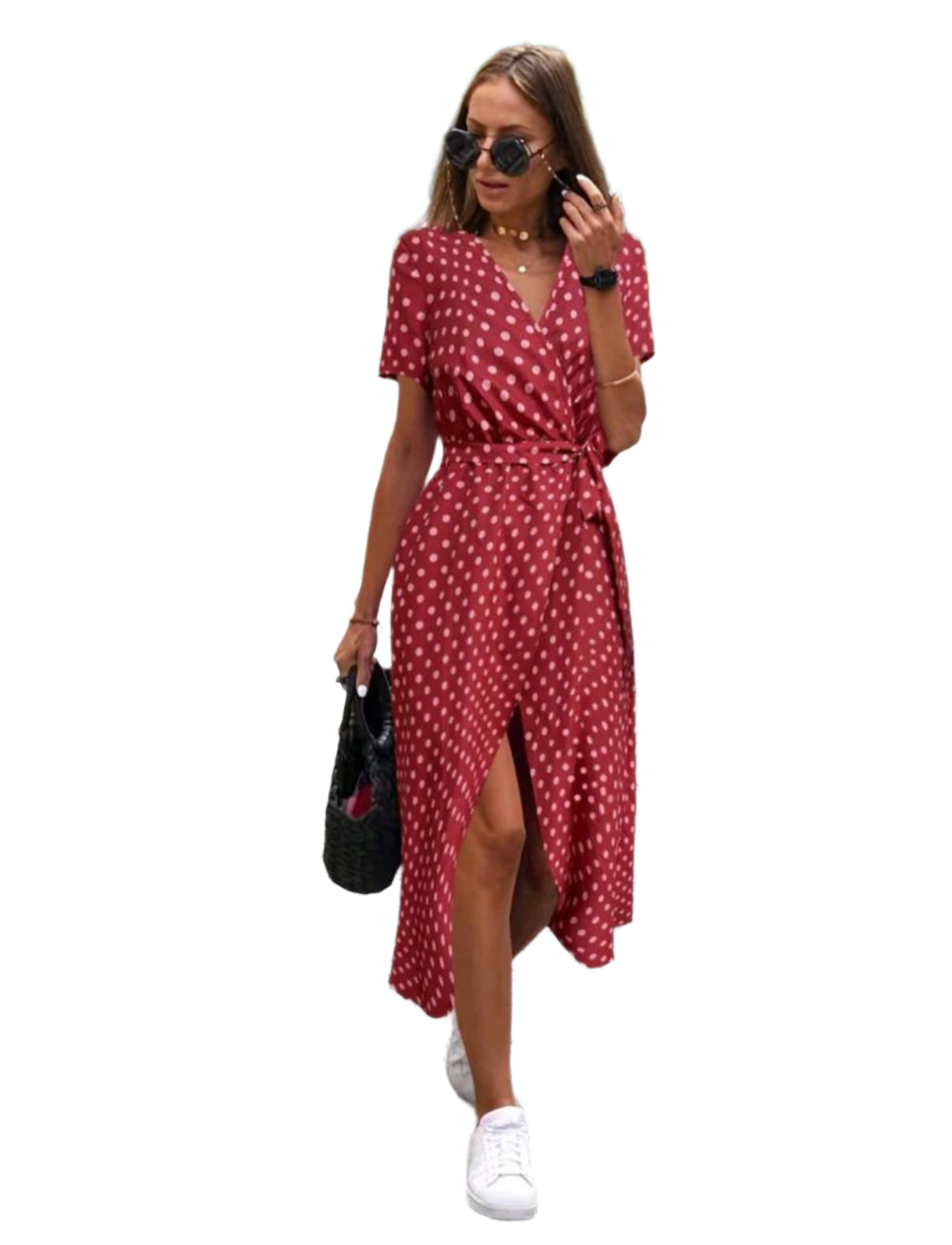 Címke nélküli, légies anyagú, bordó alapon fehér pöttyös nyári ruha. Rövid ujjú, V-nyakkivágású fazon, oldalán megkötős kialakítással, amely kiemeli a derekat. A szoknya enyhén aszimmetrikus, elöl hasítékkal, ami nőies és kényelmes viseletet biztosít. Tökéletes városi sétákhoz, nyári programokhoz vagy akár egy könnyed hétvégi viseletként.