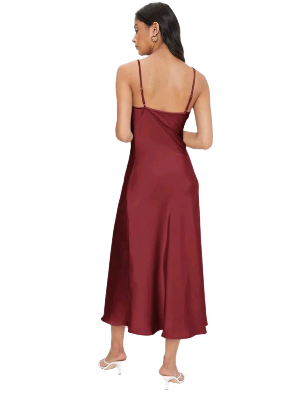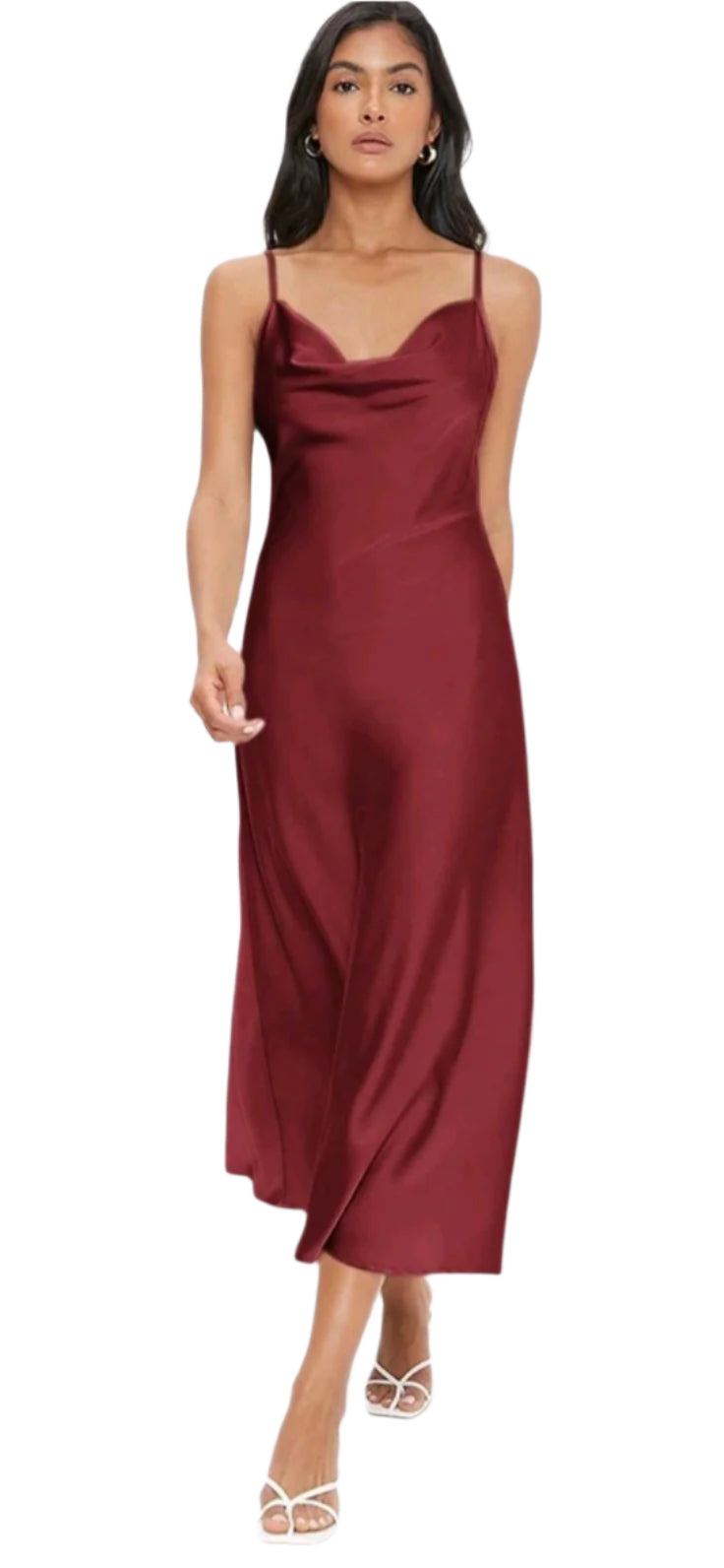 Címke nélküli, elegáns szatén midiruha vékony pántokkal és enyhén vízeséses dekoltázzsal. Lágyan leomló, fényes anyaga nőies megjelenést kölcsönöz. Tökéletes választás esküvőre, koktélpartira vagy különleges alkalmakra. Több színben elérhető.