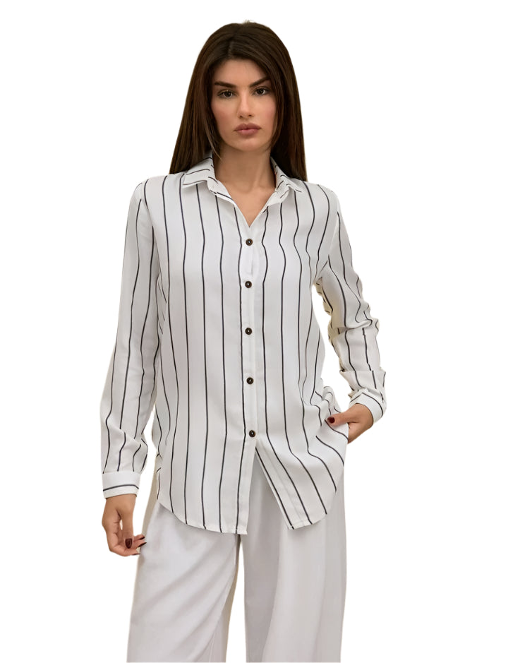 Címke nélküli, hosszú ujjú, laza fazon, klasszikus gallérral és gombos záródással. Fehér alapon vékony, függőleges csíkozás, amely optikailag nyújtja az alakot. Könnyed, légies anyag, amely tökéletes kényelmet biztosít egész nap. Stílusos és sokoldalúan kombinálható, legyen szó elegáns vagy hétköznapi viseletről.