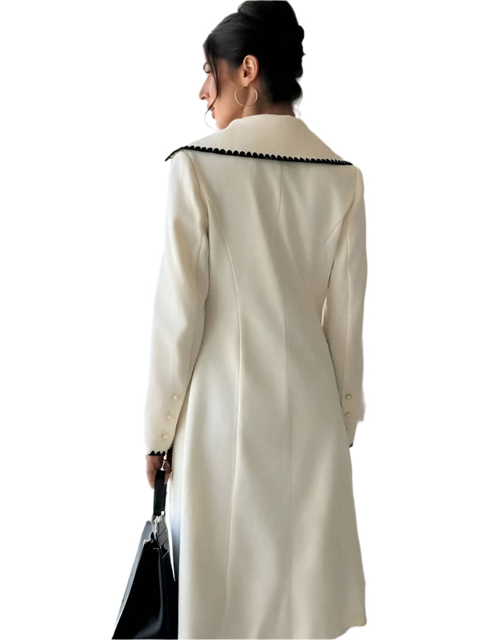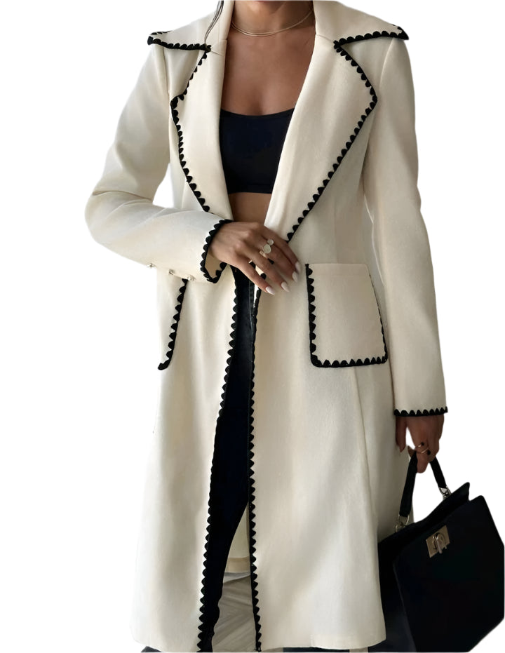 Címke nélküli, egyedi megjelenésű fehér kabát, fekete hullámvonalas szegélydíszítéssel. Elegáns és kifinomult stílusú darab, amely tökéletes választás alkalmi és üzleti viselethez is. Karcsúsított szabása kiemeli a nőies vonalakat, míg az elöl nyitott fazon modern megjelenést biztosít.