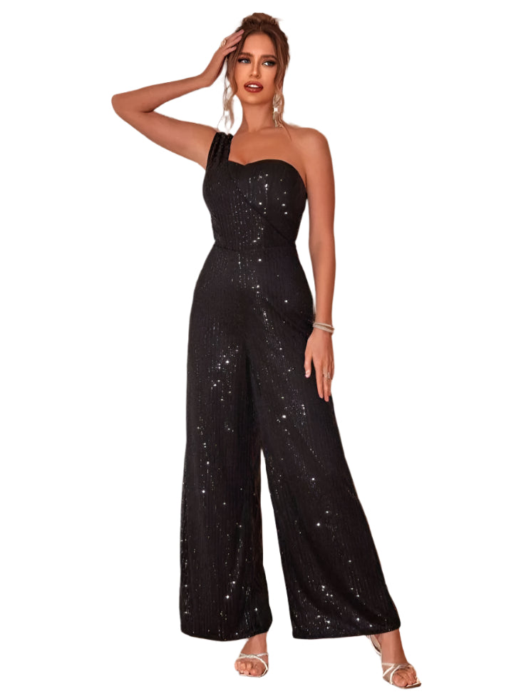 Címke nélküli, lenyűgöző flitteres overál, amely eleganciát és modern stílust sugároz. Az aszimmetrikus, egyvállas kialakítás különleges megjelenést biztosít, míg a széles szárú nadrágrész kényelmes viseletet nyújt. Tökéletes választás alkalmi eseményekre, estélyekre és partykra.