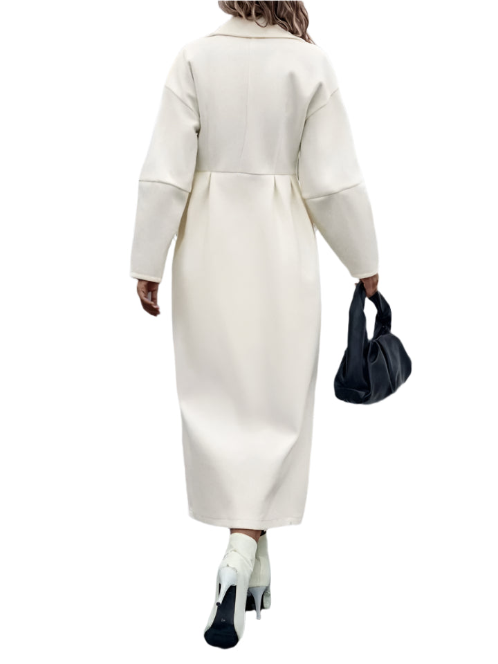 Címke nélküli, minimalista stílusú, hosszú fehér kabát. Letisztult vonalvezetésével és kényelmes szabásával tökéletes választás a hűvösebb napokra. Klasszikus eleganciát sugároz, amely könnyen kombinálható különböző outfitekkel, legyen szó alkalmi vagy hétköznapi viseletről.