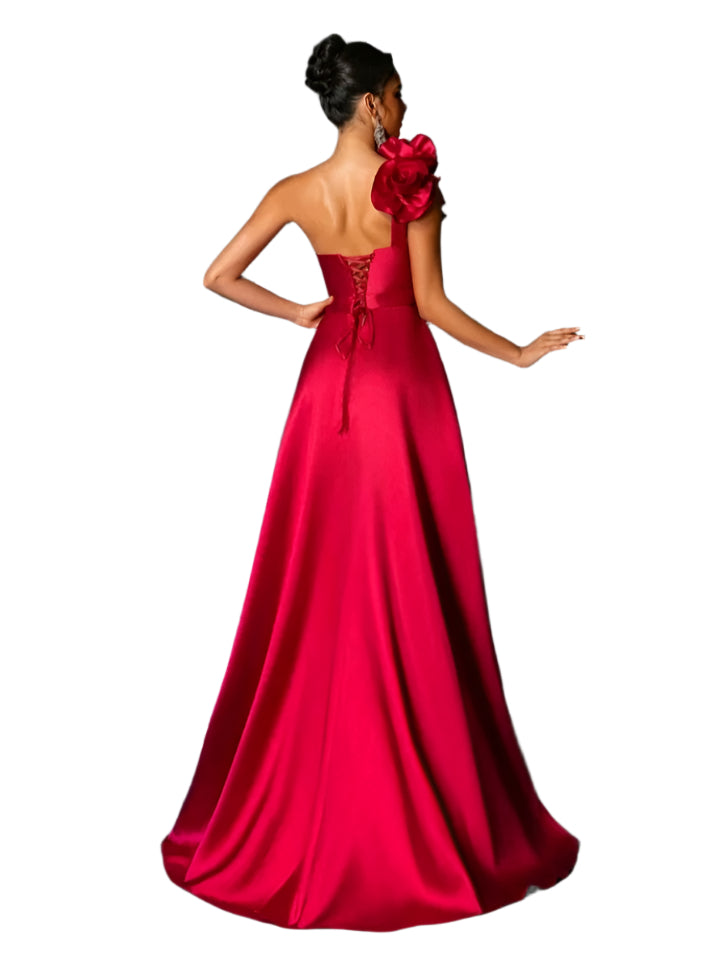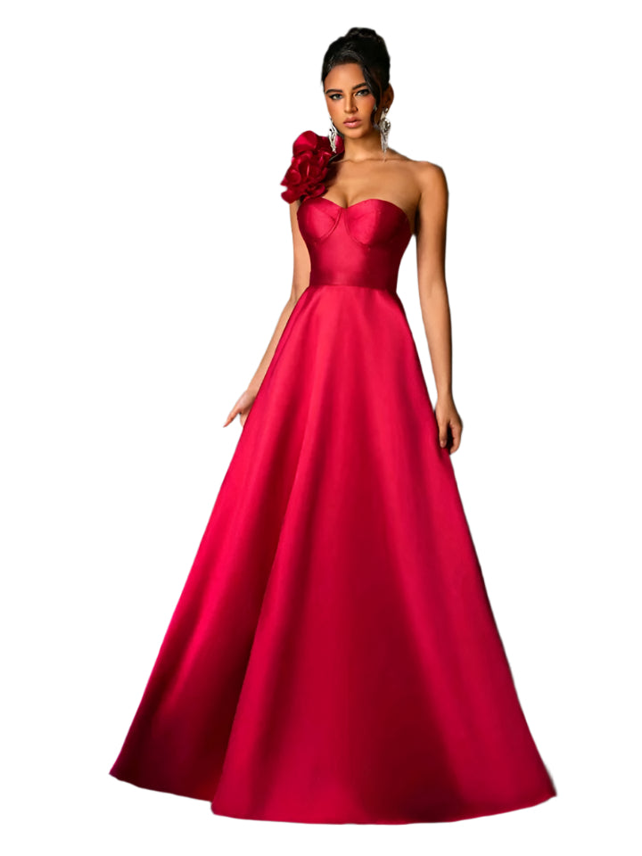 Címke nélküli, lenyűgöző megjelenésű, klasszikusan elegáns estélyi ruha. A pánt nélküli, fűzős felsőrész kiemeli a dekoltázst, míg az A-vonalú, földig érő szoknyarész királyi eleganciát kölcsönöz. Az aszimmetrikus, virágos válldísz különleges és egyedi megjelenést biztosít. Ideális választás bálokra, gálákra, esküvőkre és egyéb ünnepi alkalmakra.