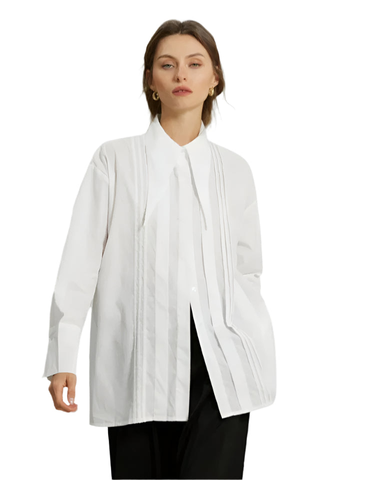 Címke nélküli, hosszú ujjú, oversized fazon, klasszikus gallérral és gombos záródással. Letisztult fehér szín, amely időtlen és sokoldalúan kombinálható. Pliszírozott részletek az előlapon, amelyek elegáns és kifinomult hatást kölcsönöznek. Könnyed, légies anyag, amely tökéletes választás irodai és alkalmi viselethez egyaránt.