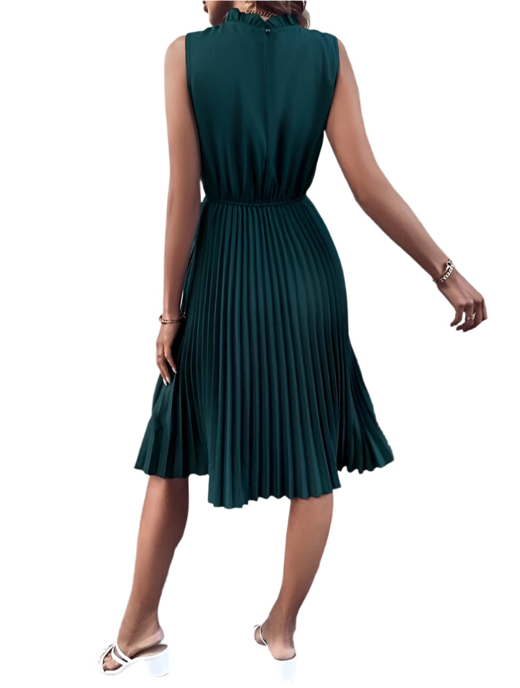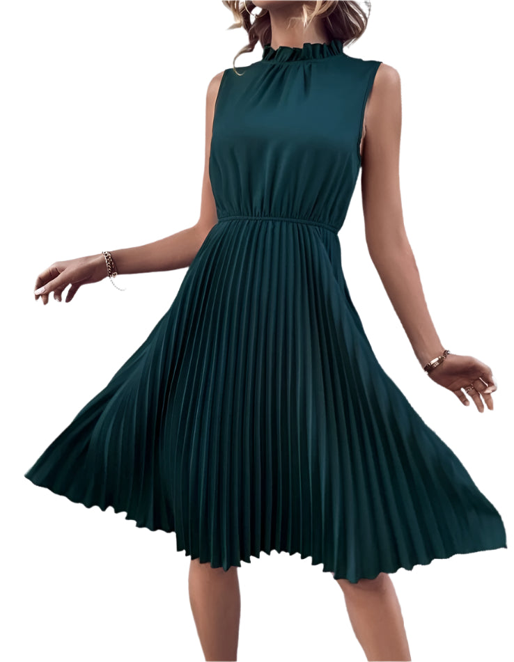 Címke nélküli, ujjatlan, pliszírozott midi ruha elegáns állógallérral. Derékban enyhén szűkített szabásvonal, amely kiemeli az alakot, miközben a könnyed anyag biztosítja a kényelmes viseletet. Tökéletes választás alkalmi eseményekre, esküvőre vagy irodai viseletként.