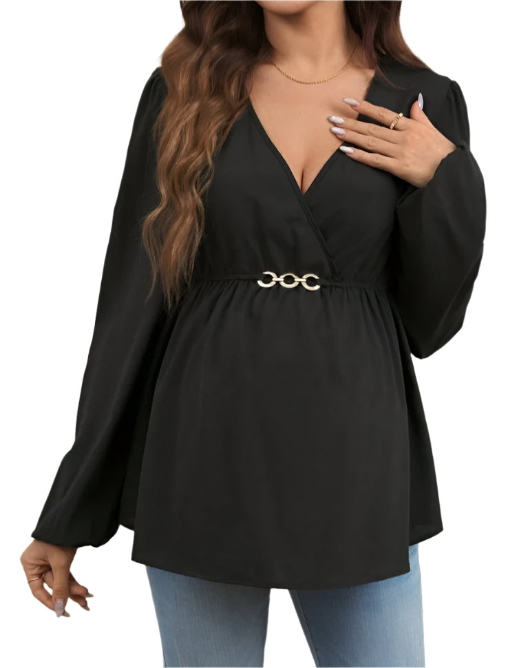 Címke nélküli, hosszú ujjú, laza fazon, mély V-nyakkivágással. Derékrészen fém díszítés, amely kiemeli az alakot és elegáns megjelenést kölcsönöz. Légies, könnyed anyag, amely kényelmes viseletet biztosít egész nap. Klasszikus fekete szín, amely tökéletes választás elegáns és hétköznapi outfitekhez egyaránt.