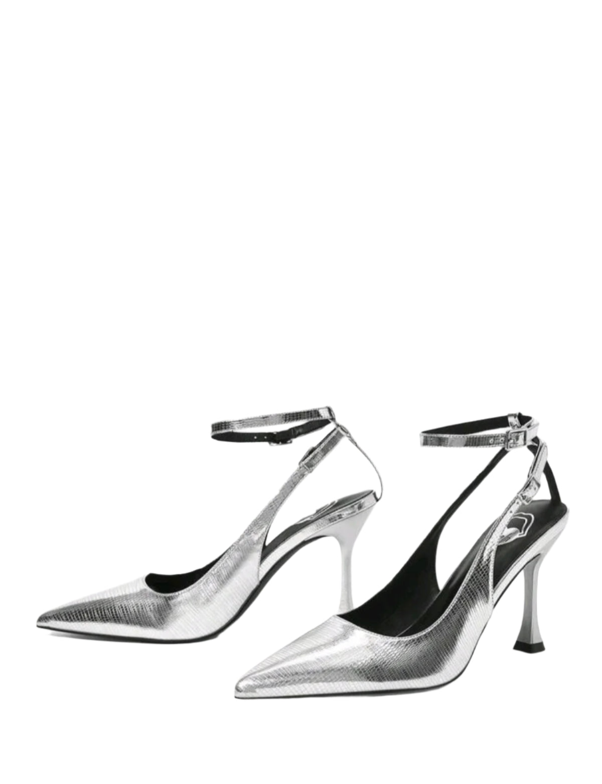 Címke nélküli, különleges fényes ezüst színű magassarkú cipő, hegyes orral és kecses, ívelt sarokkal. Bokapántos kialakításának köszönhetően biztos tartást nyújt. Elegáns, mégis modern fazon, amely tökéletes választás alkalmi megjelenéshez, bulira, rendezvényre vagy ünnepi eseményekre.