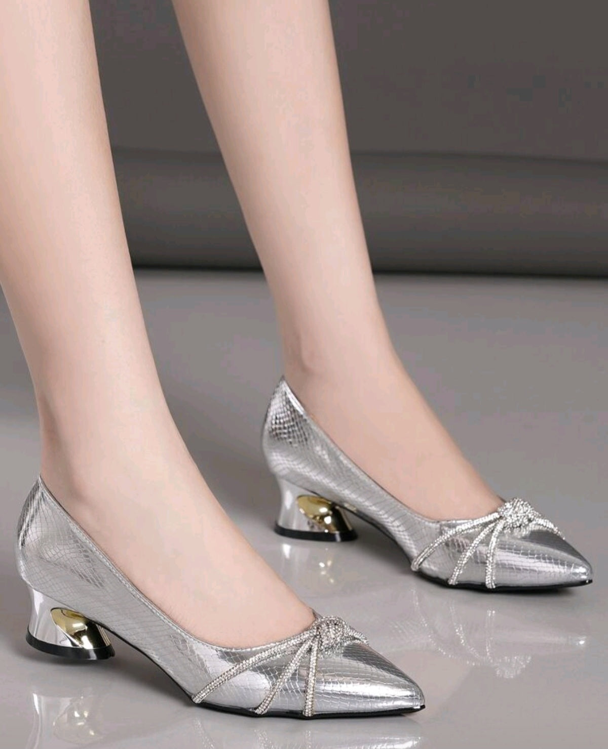 Címke nélküli, fényes ezüst színű, enyhén kígyóbőr mintázatú cipő, díszes masnival az orr-részen. Kényelmes, alacsony, enyhén különleges formájú sarokkal és elegáns megjelenéssel. Tökéletes választás ünnepi alkalmakra, elegáns eseményekre vagy stílusos hétköznapokra.
