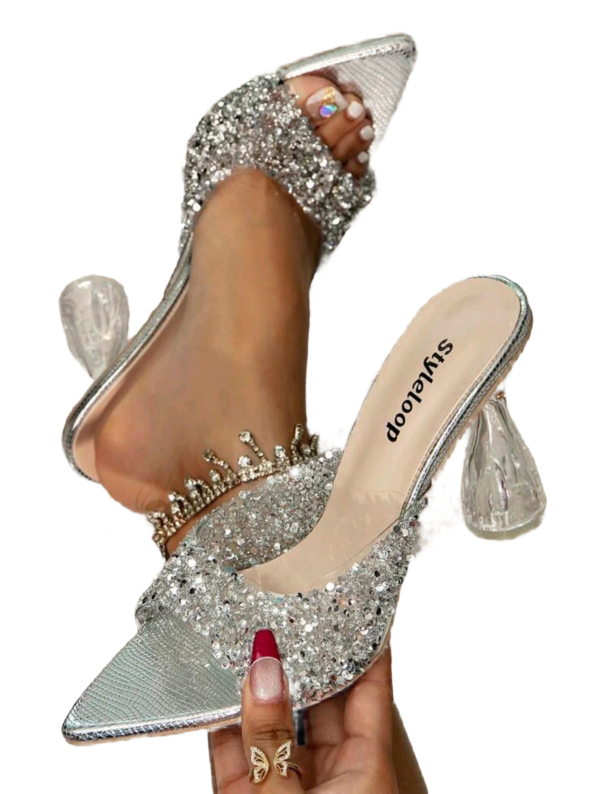 Címke nélküli, elegáns ezüst színű papucs csillogó strasszos pánttal és egyedi átlátszó sarokkal. Kifinomult és stílusos megjelenés, amely tökéletes választás alkalmi és esti viselethez.