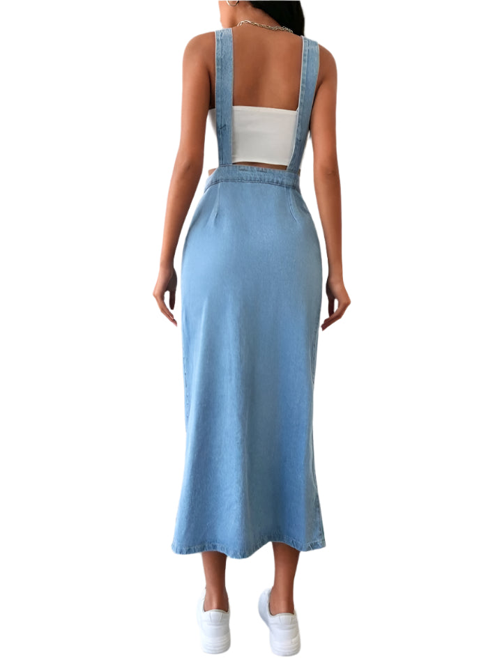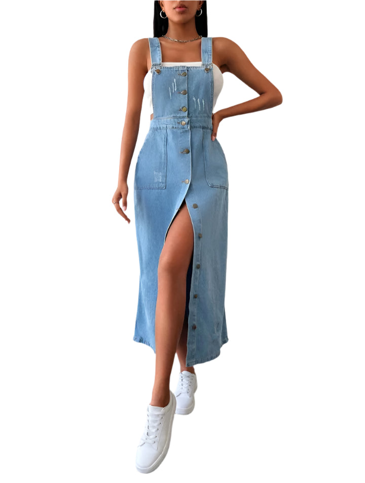 Címke nélküli, divatos és laza stílusú hosszú farmer ruha, amely tökéletes választás a hétköznapokra. A kantáros kialakítás sportos és trendi megjelenést biztosít, míg az elöl gombos záródás és a slicc modern és nőies vonalat kölcsönöz. Könnyedén kombinálható pólóval vagy crop toppal, valamint sneakerrel vagy szandállal egyaránt.