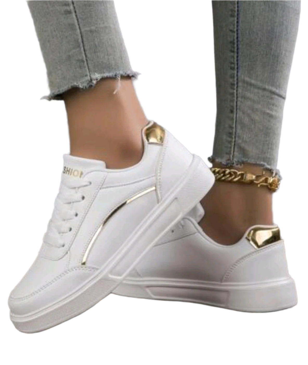 Címke nélküli, trendi fehér sportcipő arany díszítéssel. Klasszikus fűzős kialakítás, kényelmes és könnyű viselet mindennapi használatra. Párnázott talppal és stabil szerkezettel biztosítja a komfortot egész napra. Tökéletes választás sportos és hétköznapi outfitekhez.