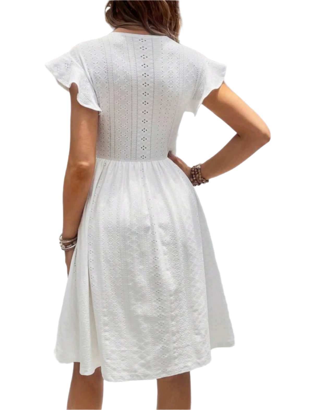 Címke nélküli, női nyári ruha, fehér színű, légies és romantikus kialakítással. V-nyakkivágással, finom csipkebetétekkel és fodros rövid ujjakkal. Karcsúsított derékrész, bővülő midi hosszúságú szoknyarésszel. Könnyed és nőies viselet, tökéletes nyári napokra és alkalmi eseményekre.