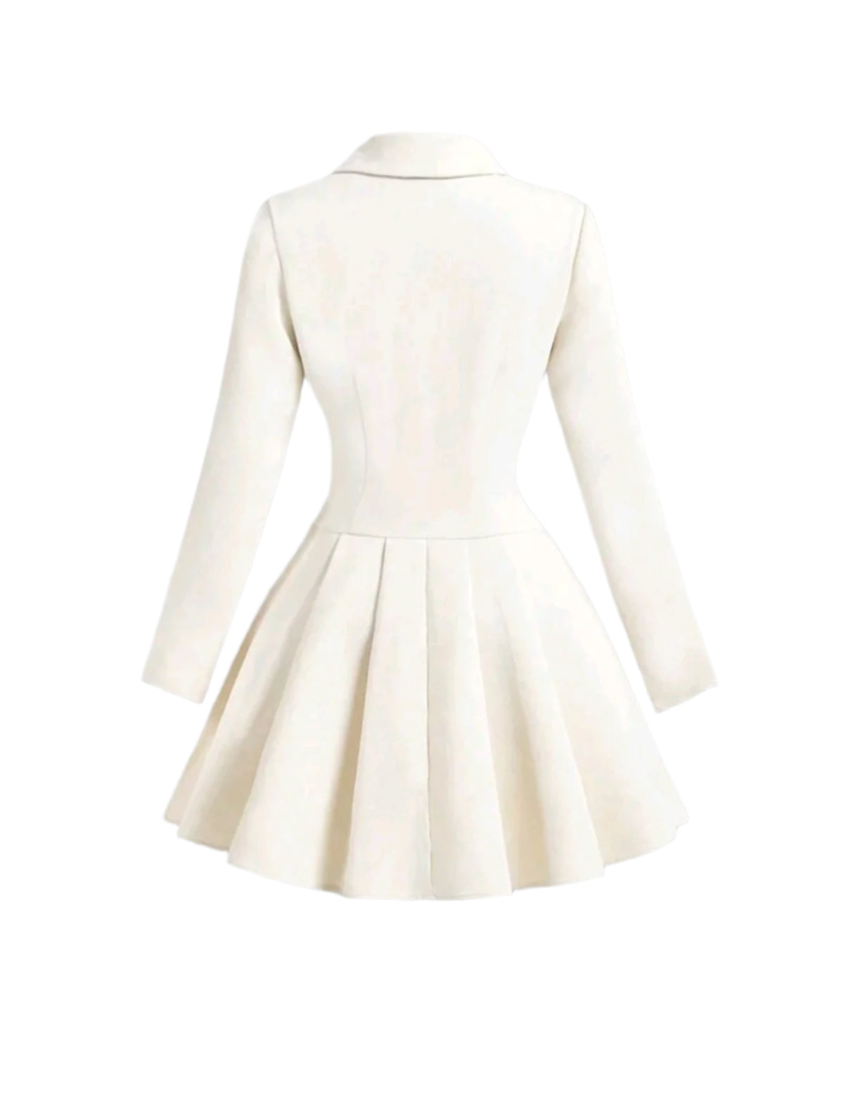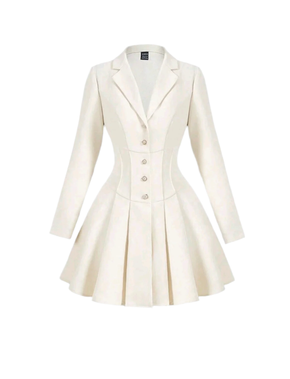 Címke nélküli, fehér, elegáns blézerruha karcsúsított derékkialakítással és pliszírozott szoknyarésszel. Hosszú ujjú, klasszikus galléros nyakkivágással és elöl gombokkal díszítve. A testhezálló felsőrész kiemeli az alakot, míg a bővülő szoknyarész nőies és kifinomult megjelenést kölcsönöz. Tökéletes választás irodai viselethez, elegáns eseményekre vagy különleges alkalmakra.