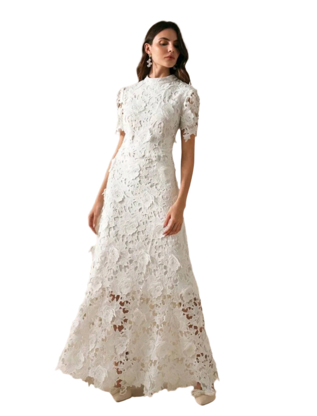 Címke nélküli, női elegáns maxi ruha, fehér színű, finom virágos csipke anyagból. Magas nyakkivágással, rövid ujjakkal és karcsúsított derékrésszel. A-line szabás, részben áttetsző csipkehatással a szoknyán. Kifinomult és romantikus megjelenés, tökéletes alkalmi, esküvői vagy elegáns eseményekre.