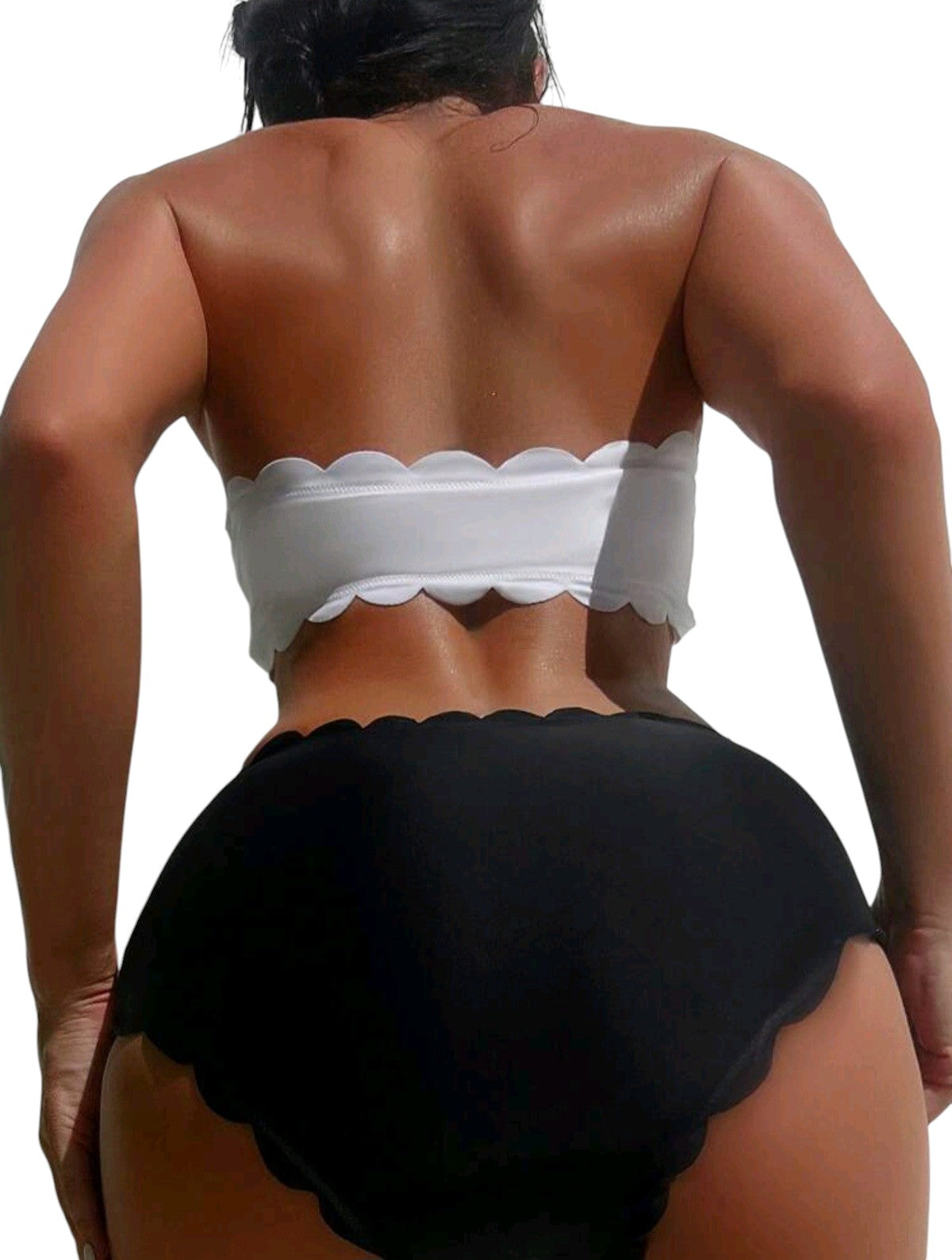 Címke nélküli, fehér, fekete, virágos, fodros, kétrészes, pánt nélküli nyakkivágás, pánt nélküli, fodros derékrész, fekete rózsa díszítés.