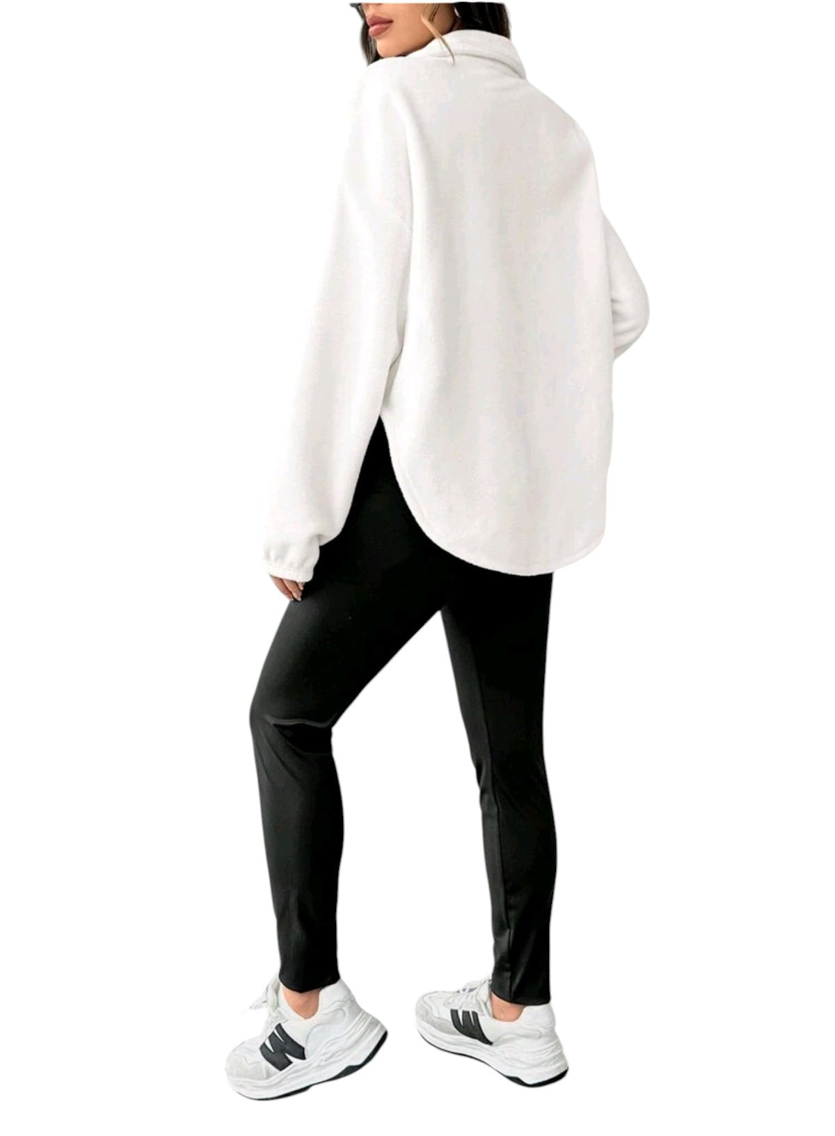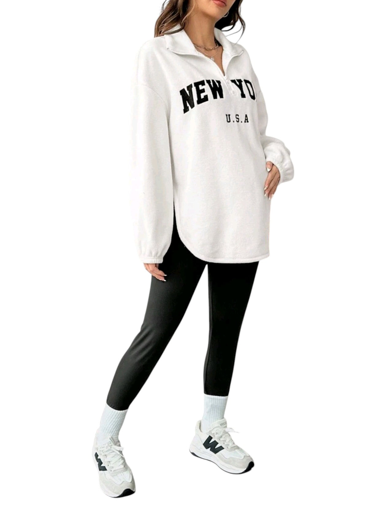 Címke nélküli, fehér, poliészter, cipzáros pulóver, hosszú ujjú, feliratos.