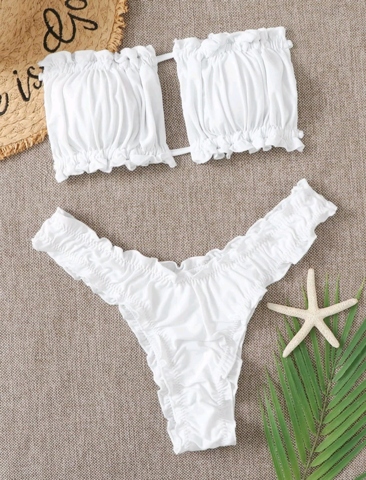 Címke nélküli, fehér, puha anyagú, bandeau fazonú felsőrész, fodros részletekkel, pánt nélküli kialakítással, hozzá illő fodros, alacsony derekú bikini alsóval, romantikus és nőies megjelenéshez.