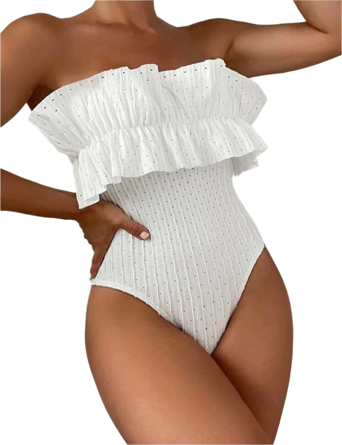 Címke nélküli, fehér, lyukhímzett bordázott anyag, egyrészes fazon, egyenes nyakkivágás, pánt nélküli kialakítás, deréknál karcsúsított, dupla fodros mellrész.