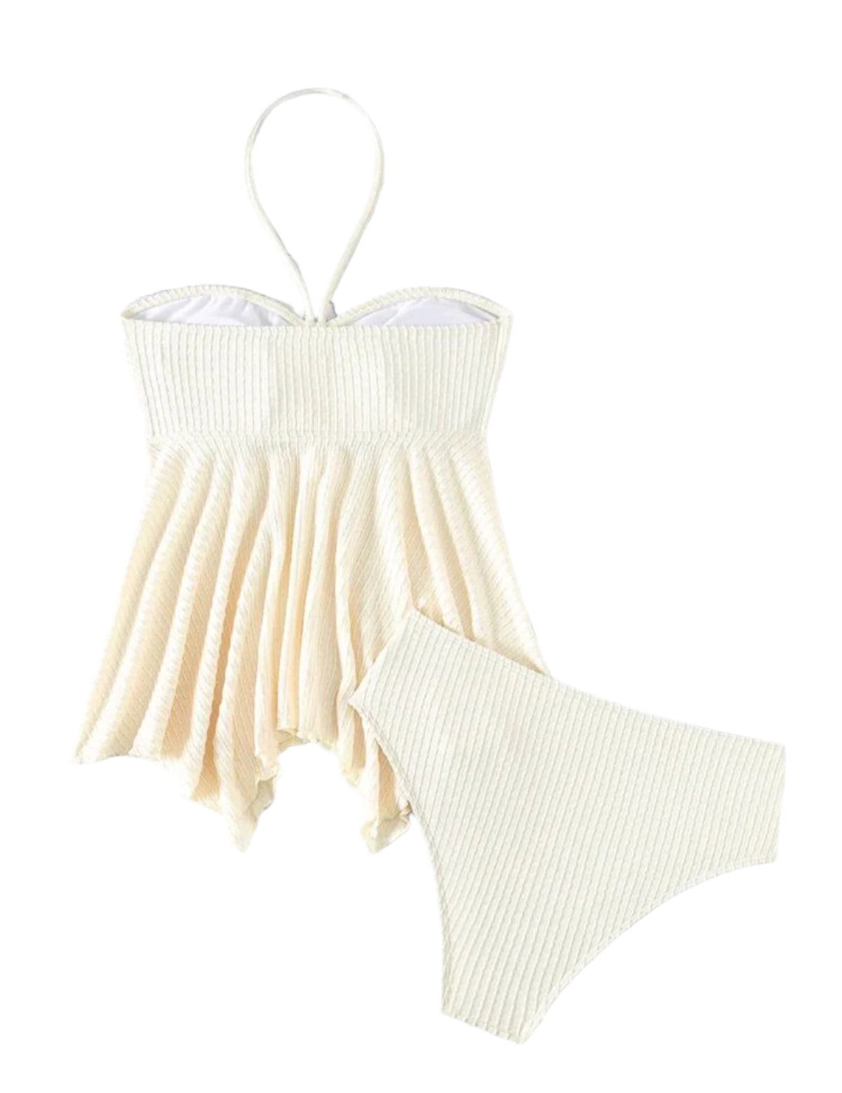 Címke nélküli, fehér, bordázott anyag, egyrészes fazon, egyenes nyakkivágás, nyakba akasztós pánt, mell alatt megkötős részlet, bő, fodros szabás.