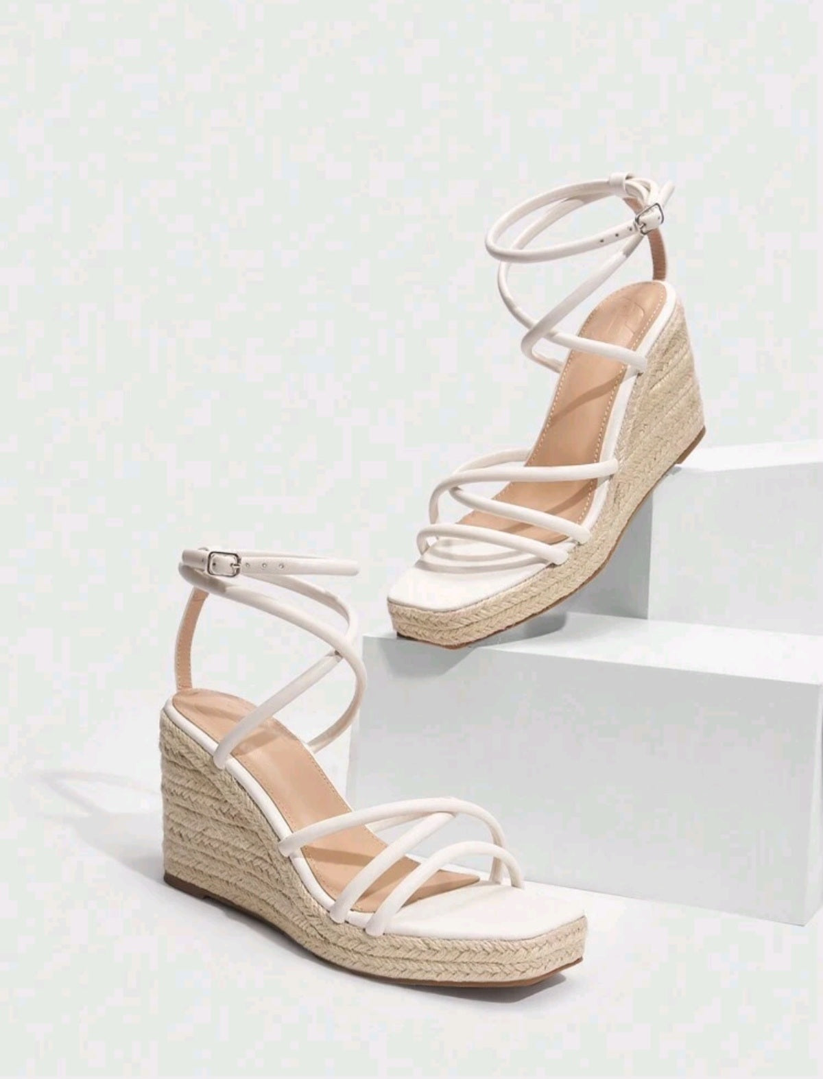 Címke nélküli, fehér pántos szandál fonott hatású platformtalppal és bokapántos rögzítéssel. A kényelmes emelés és a nőies kialakítás tökéletes választás nyári sétákhoz, vakációhoz vagy könnyed nappali eseményekhez.