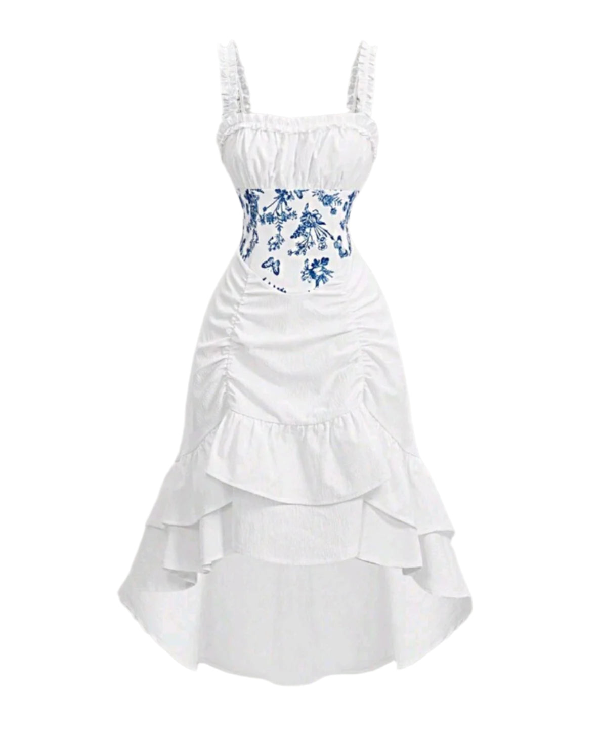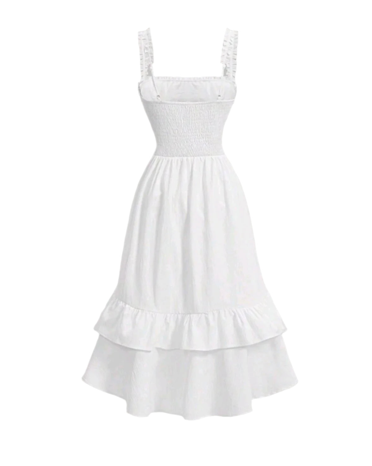 Címke nélküli, elegáns fehér midi ruha romantikus fodrokkal és virágmintás fűzős betéttel. Puha, könnyed anyaga kényelmes viseletet biztosít, míg a testhezálló felsőrész nőies megjelenést kölcsönöz. Tökéletes választás nyári alkalmakra vagy különleges eseményekre.