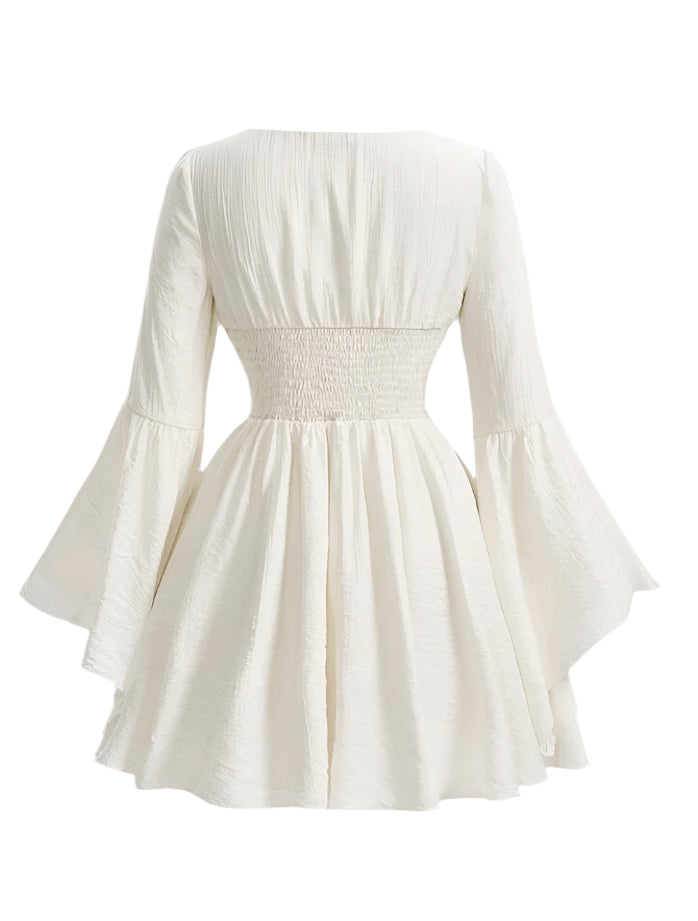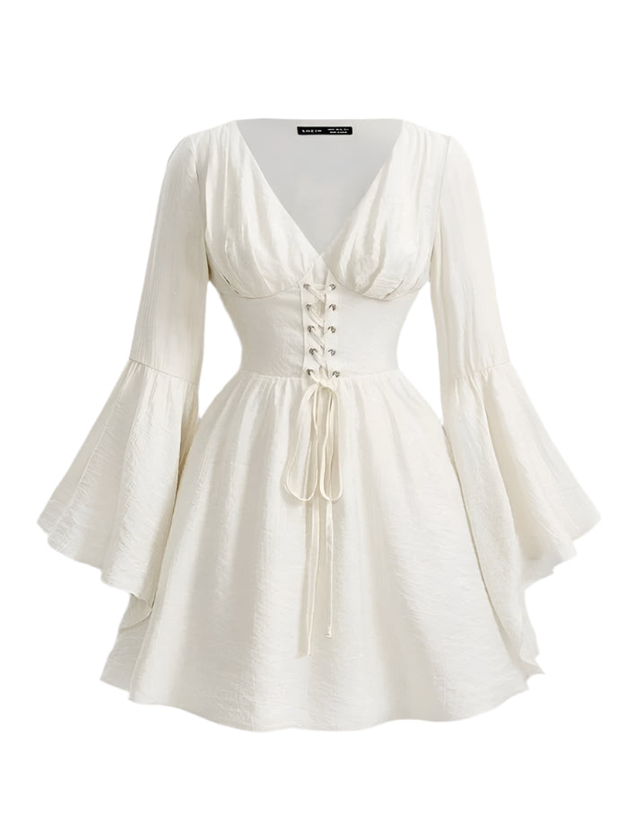 Címke nélküli, fehér, romantikus stílusú ruha harang alakú ujjakkal és fűzős derékkialakítással. Mély V-kivágású, testhezálló felsőrésze nőies megjelenést biztosít, míg az enyhén bővülő szoknyarész könnyed és légies hatást kelt. A deréknál megköthető fűző kiemeli az alakot és egyedi részletet ad a ruhának. Ideális választás tavaszi-nyári alkalmakra, romantikus randevúkra vagy bohém stílus kedvelőinek.