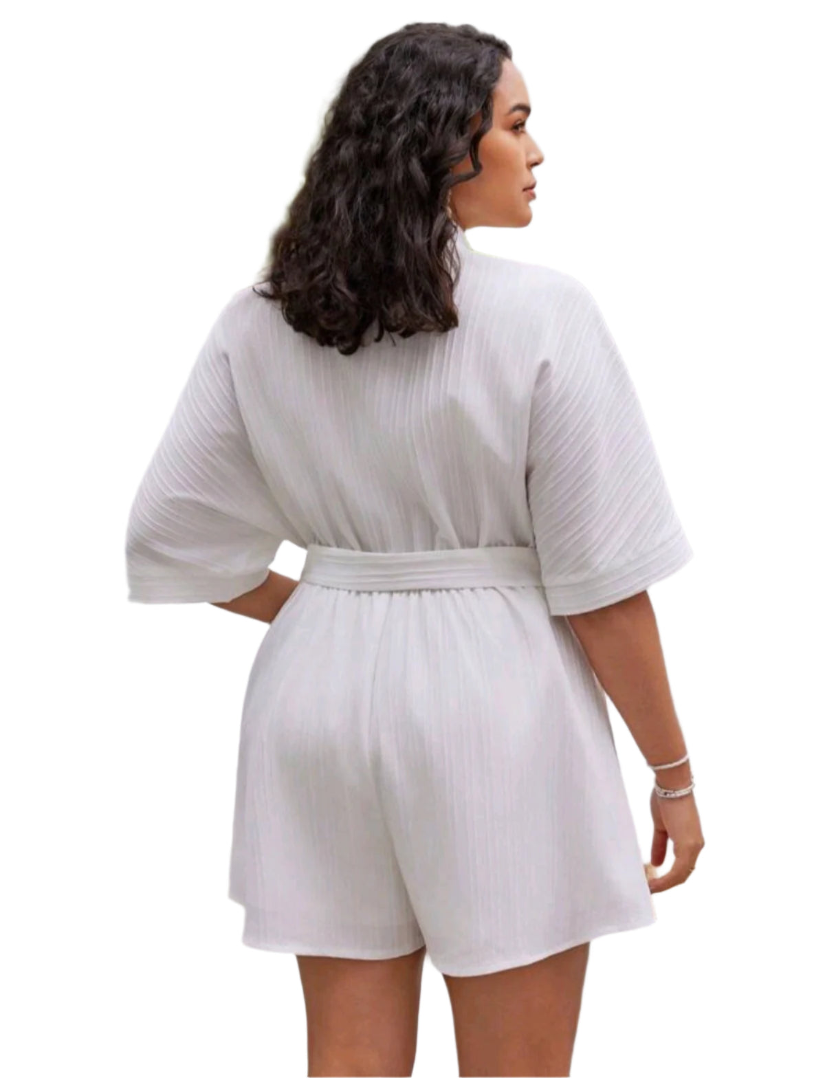 Címke nélküli, könnyű és légies fehér overál galléros nyakkivágással és elöl gombos kialakítással. A lágyan redőzött anyag és a derékmegkötő nőies sziluettet ad, miközben kényelmes viseletet biztosít. Rövid ujjú fazonja ideális a melegebb napokra, tökéletes választás nyaraláshoz, városi sétákhoz vagy hétköznapi viselethez.