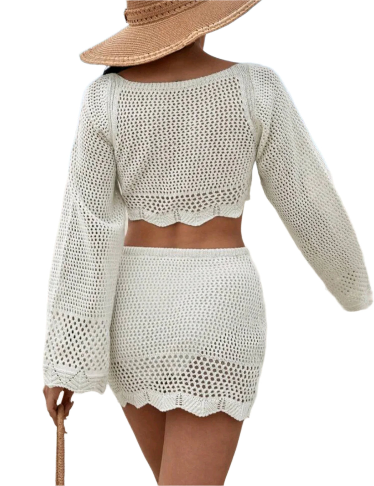 Címke nélküli, könnyed és szellős horgolt szett, amely egy hosszú ujjú, crop topból és egy mini szoknyából áll. Fehér, áttört mintás anyagával tökéletes választás strandoláshoz vagy nyári fesztiválokra. Boho stílusú, romantikus darab a meleg napokra.