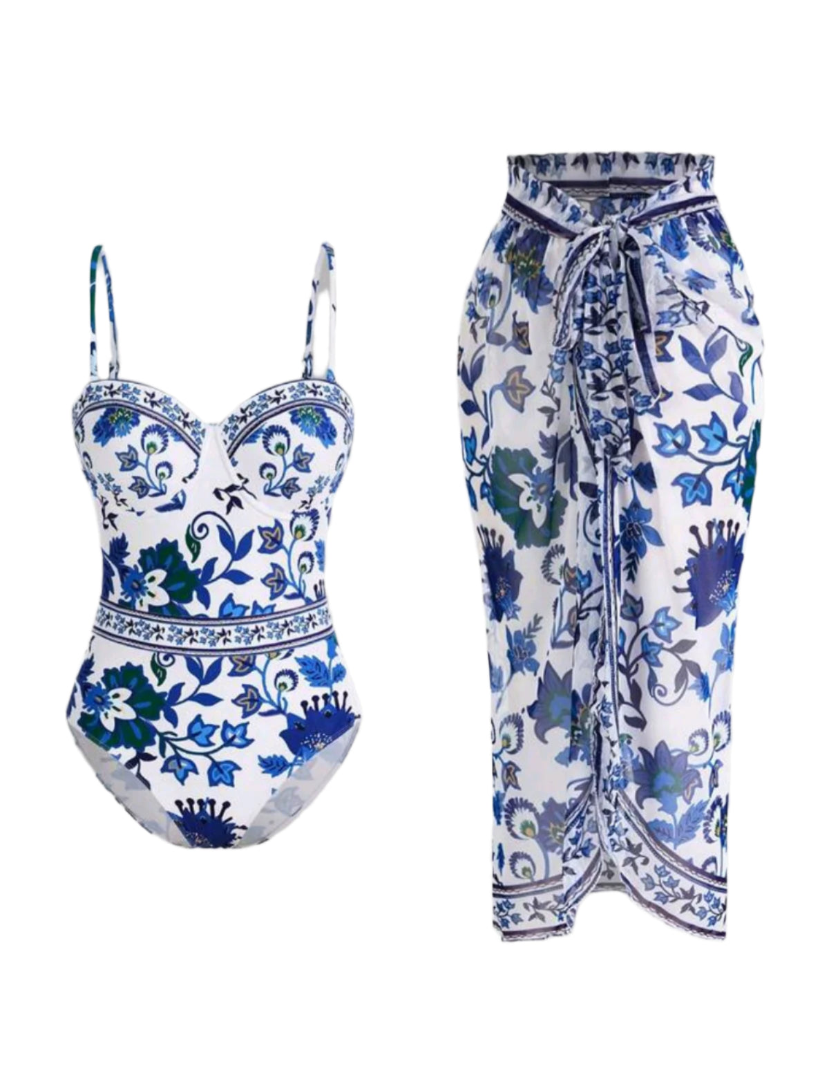 SHE fehér kék mintás egyberészes fürdőruha szoknyával