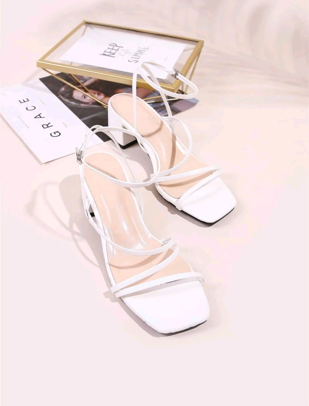 Címke nélküli, fehér színű, minimalista kialakítású szandál vékony pántokkal és bokapántos zárással. Kényelmes, vastag sarokkal ellátott fazon, amely egyszerre elegáns és visszafogott. Tökéletes választás nyári eseményekre, esküvőre vagy alkalmi megjelenéshez.