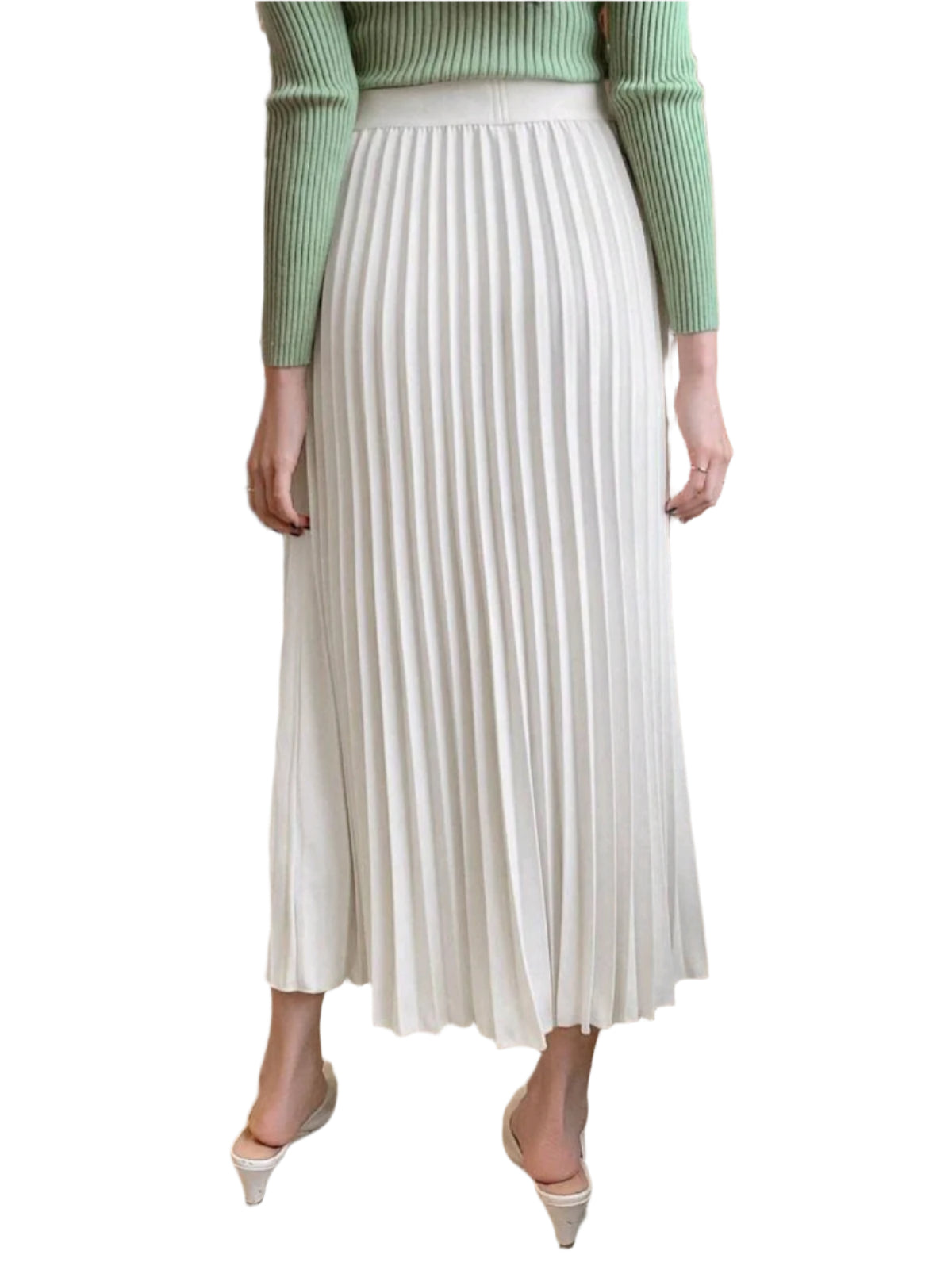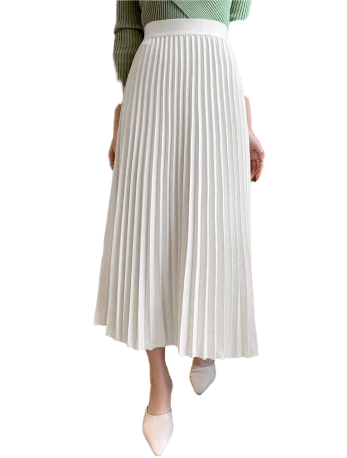 Címke nélküli, fehér, magas derekú pliszírozott midi szoknya. Könnyed, légies anyaga elegáns megjelenést biztosít, míg az elasztikus derékrész kényelmes viseletet garantál. Ideális választás alkalmi vagy hétköznapi outfitekhez.