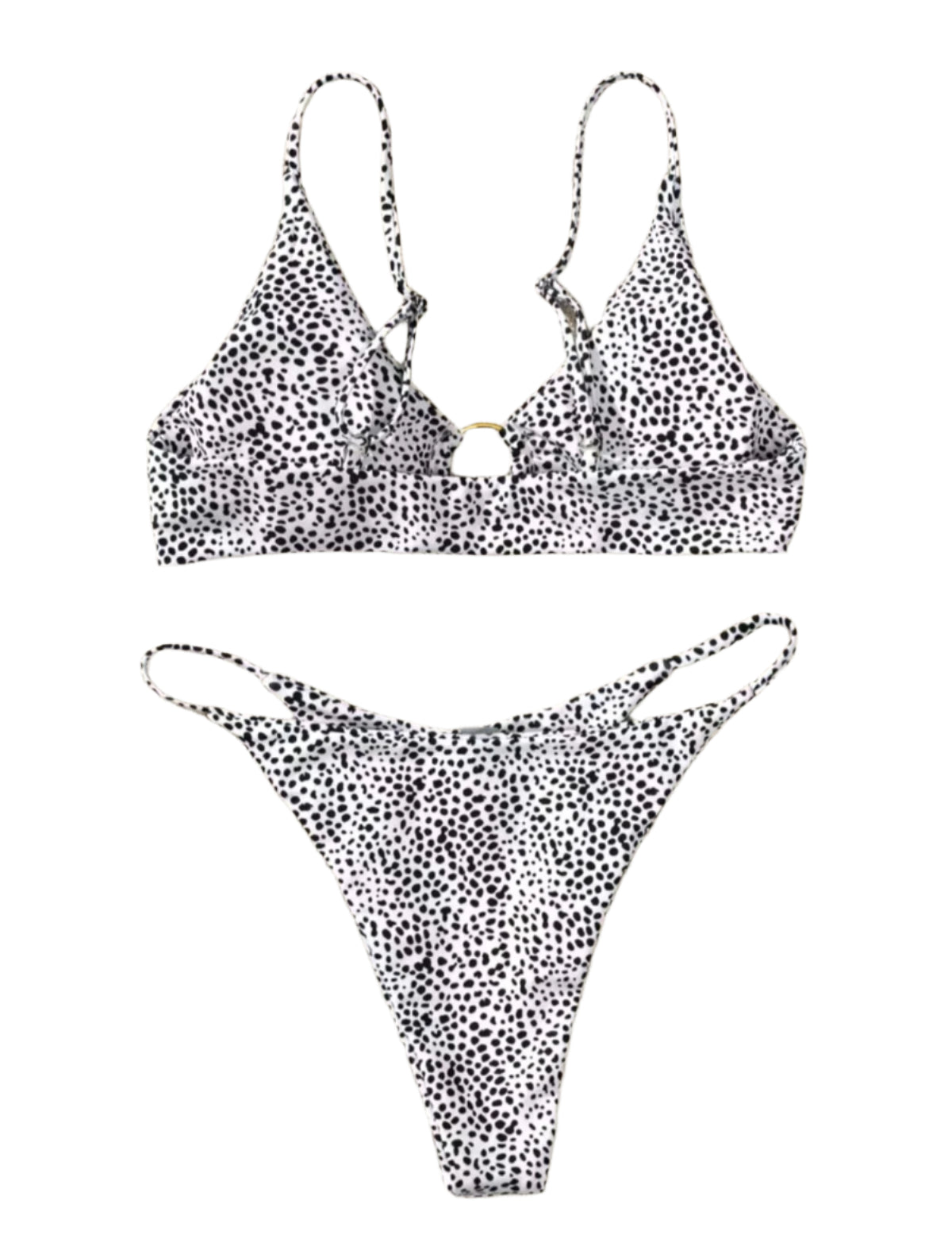 Címke nélküli, fehér alapon fekete pöttyös minta, rugalmas anyag, háromszög fazonú felső aranyszínű karikadísszel, vékony pántok, magasított derekú alsó a merészebb megjelenésért.