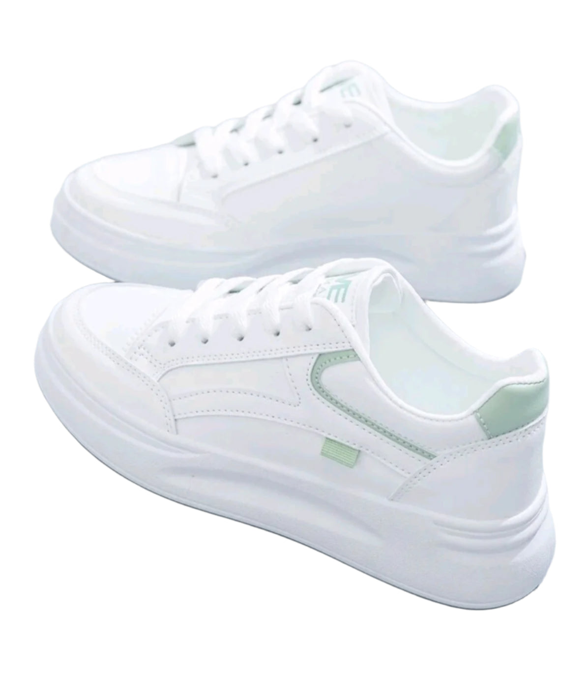Címke nélküli, fehér sportcipő, amely letisztult és modern megjelenést biztosít. Klasszikus fűzős kialakítású, oldalt finom varrásokkal díszített. A sarkán és az oldalán visszafogott zöld részletek találhatók, amelyek stílusos kontrasztot teremtenek. Vastag, kényelmes talppal rendelkezik, amely megfelelő tartást és komfortot nyújt a mindennapi viselethez. Tökéletes választás casual öltözethez, farmerrel vagy sportos szettekhez.