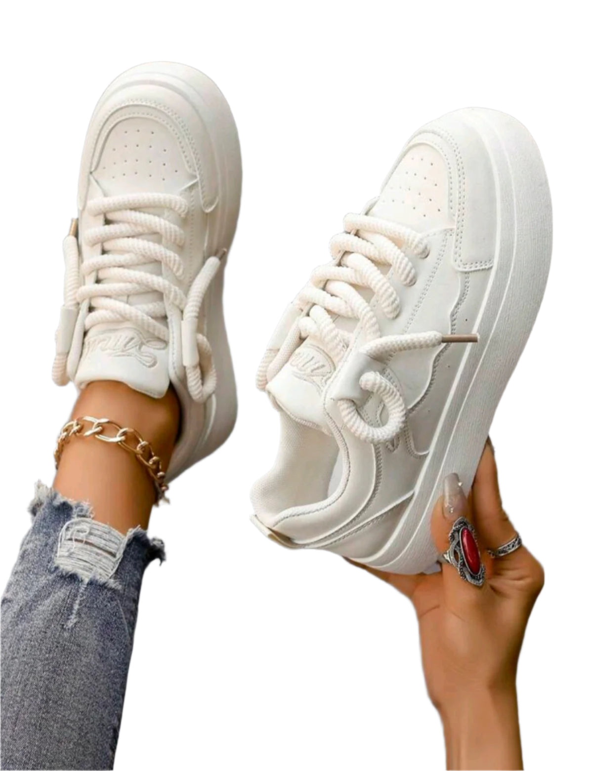 Címke nélküli, divatos vastag talpú sportcipő krémszínű árnyalatban. Párnázott belső kialakításának köszönhetően extra kényelmes viselet. A masszív, mégis könnyű talp trendi és modern megjelenést biztosít, míg a vastag fűzők sportos, vagány stílust kölcsönöznek. Ideális mindennapi viselethez és utcai divathoz.