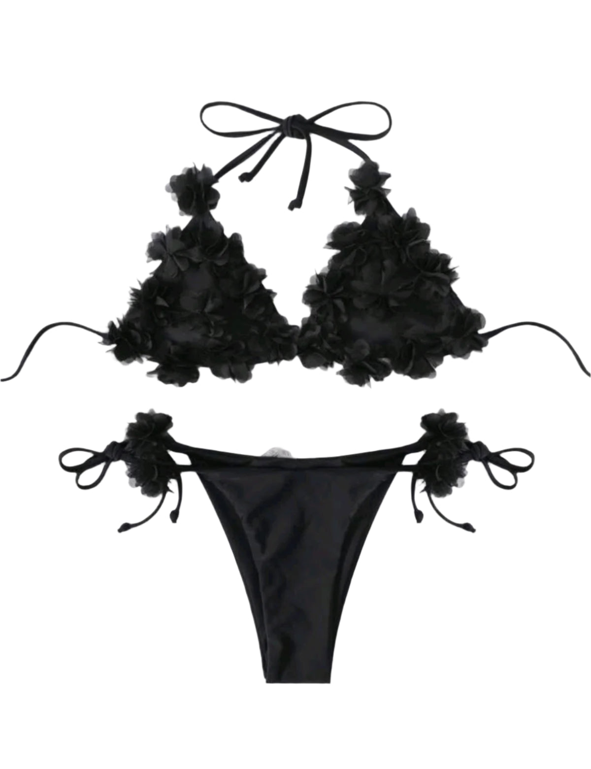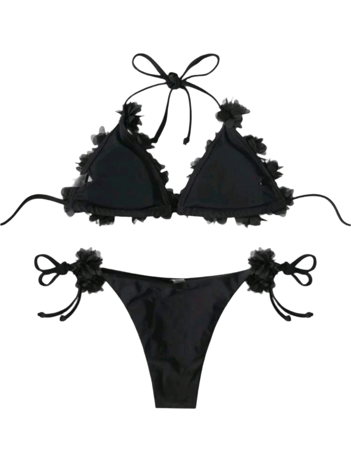 Címke nélküli, fekete színű, rugalmas anyag, háromszög fazonú felső 3D virágdíszítéssel, megkötős pántokkal, oldalt megkötős alsó 3D virágokkal, nőies és különleges megjelenés.