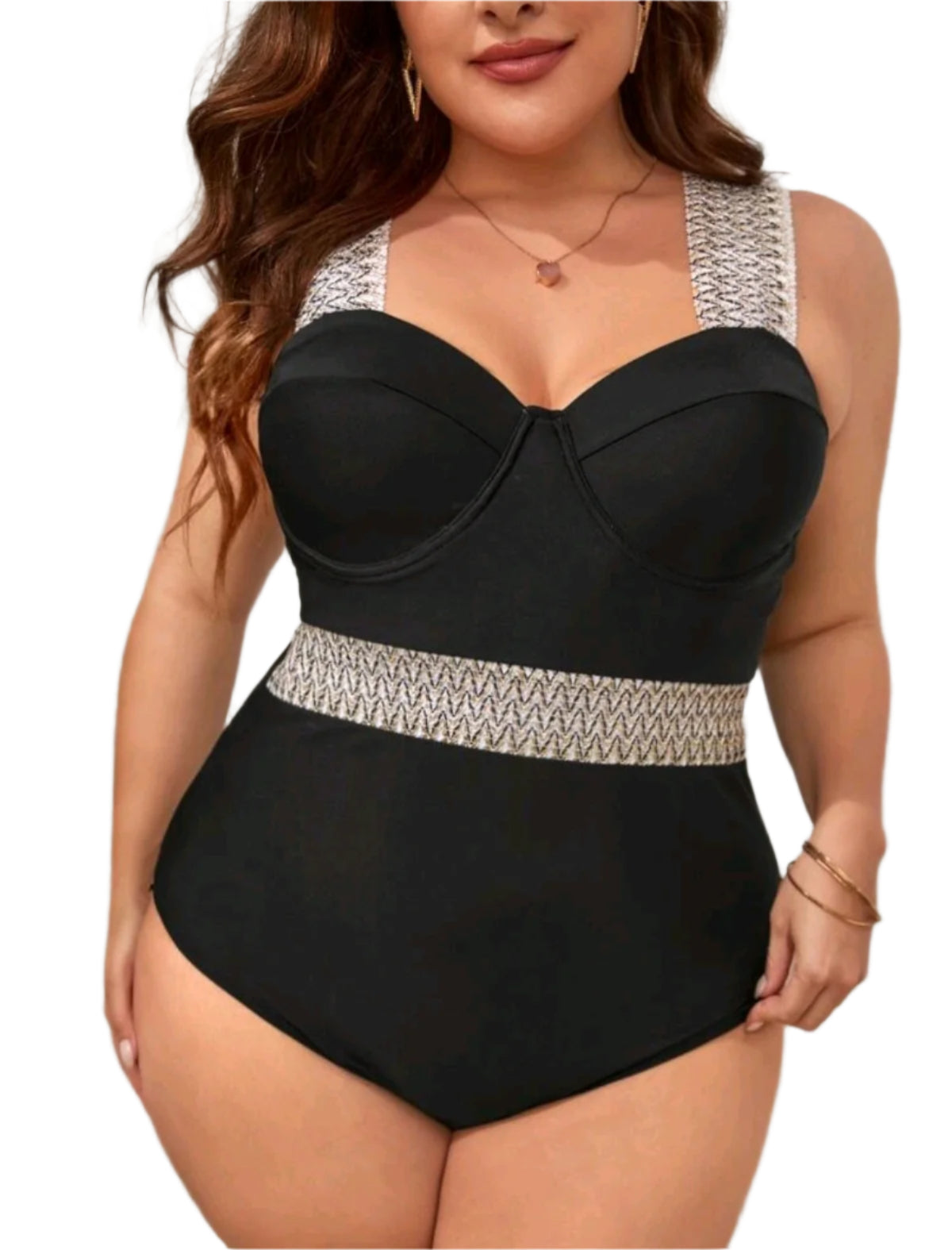 Címke nélküli, elegáns fekete egyrészes fürdőruha, mellrésznél merevítőkkel, vastag mintás pántokkal és deréknál rugalmas, zig-zag mintás sávval. Karcsúsító hatású szabás, kényelmes viselet nyaraláshoz, strandoláshoz vagy wellnesshez. Kifejezetten teltkarcsú testalkatra tervezve.