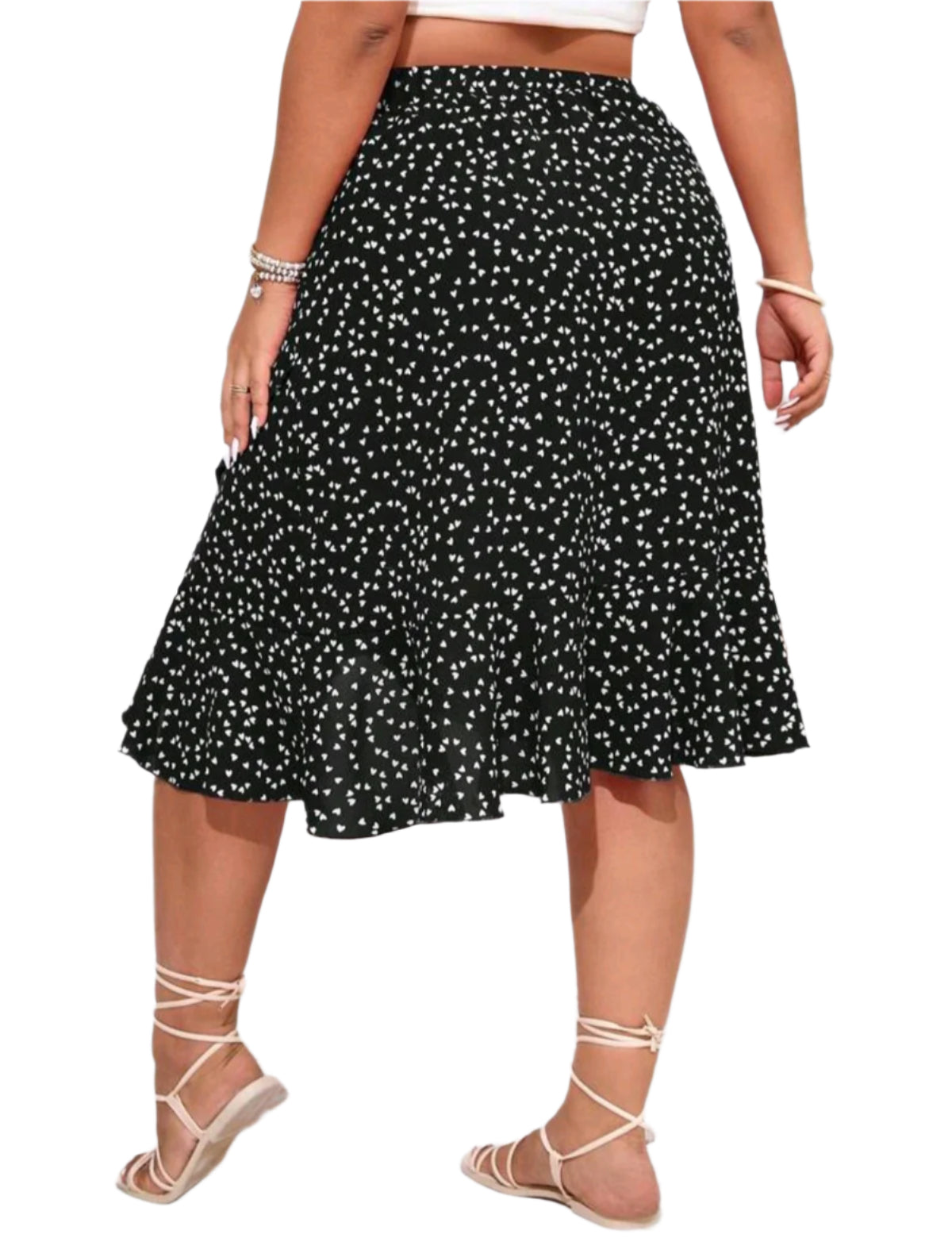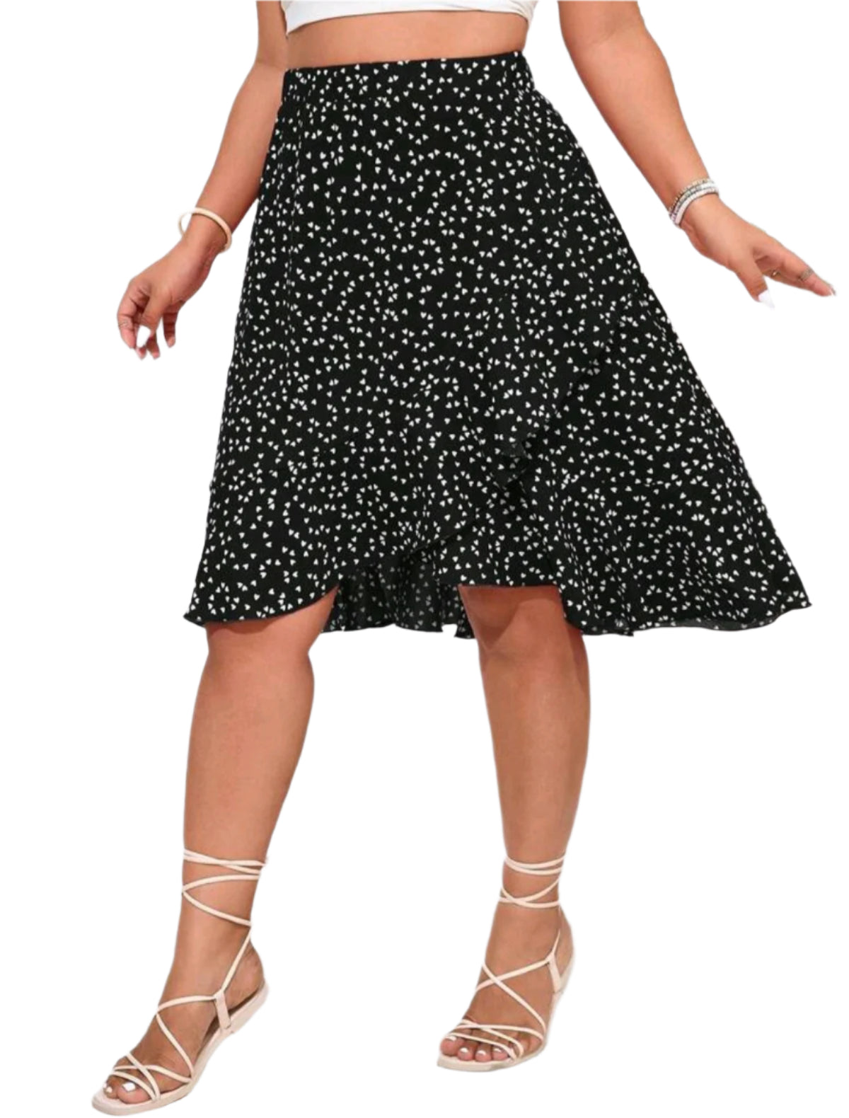 Címke nélküli, fekete alapon fehér mintás aszimmetrikus fodros szoknya. Könnyed, légies anyagból készült, amely tökéletes nyári viseletként szolgál. Magas derekú fazon, amely kiemeli az alakot, és kényelmes viseletet biztosít. Ideális hétköznapi és alkalmi összeállításokhoz egyaránt.