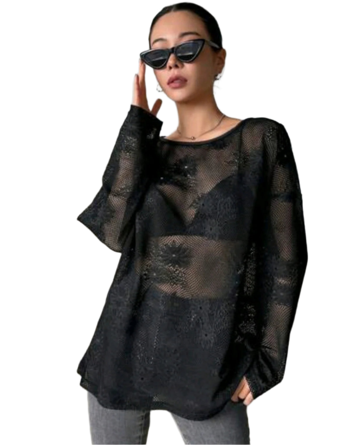 Címke nélküli, elegáns és merész fekete hálós felső, finom csipkés mintázattal. Laza szabású, hosszú ujjú kialakításának köszönhetően kényelmes viselet. Tökéletes rétegezéshez vagy önmagában egyedi megjelenéshez. Ideális esti alkalmakra vagy divatos streetwear szettekhez.