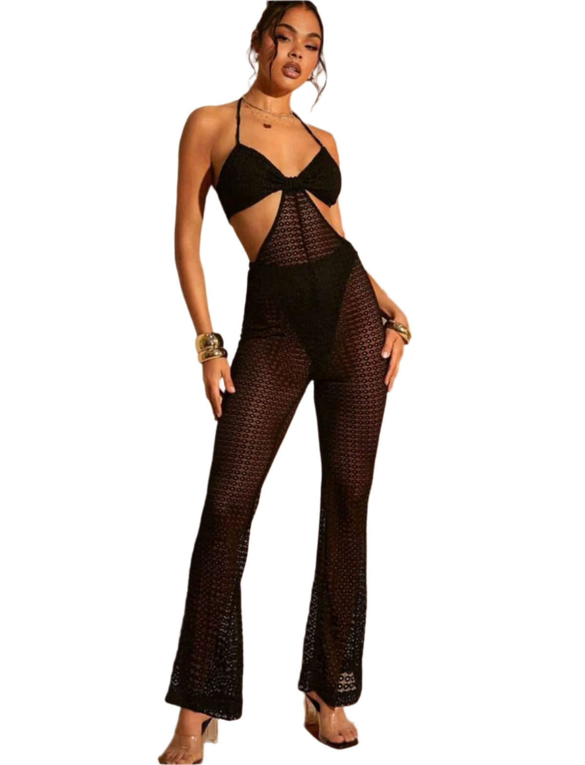 Címke nélküli, szexi, átlátszó fekete overall, körmintás hálós anyagból. Háromszög fazonú, nyakbakötős felsőrésszel és kivágott derékmegoldással. Testhezálló szabás, hosszú szárú nadrésszel. Ideális nyári bulikra, tengerparti partikra vagy egy merész esti megjelenéshez.