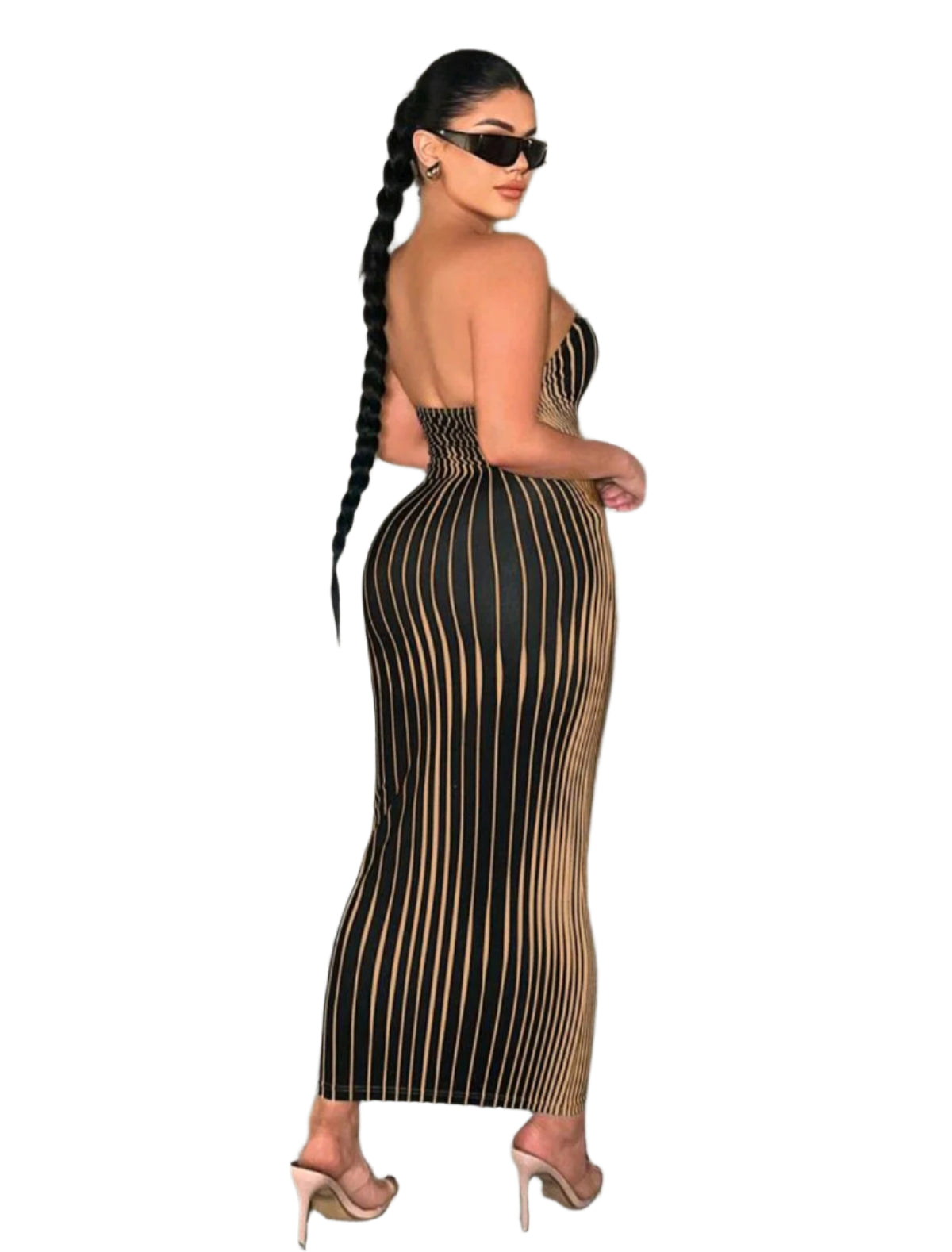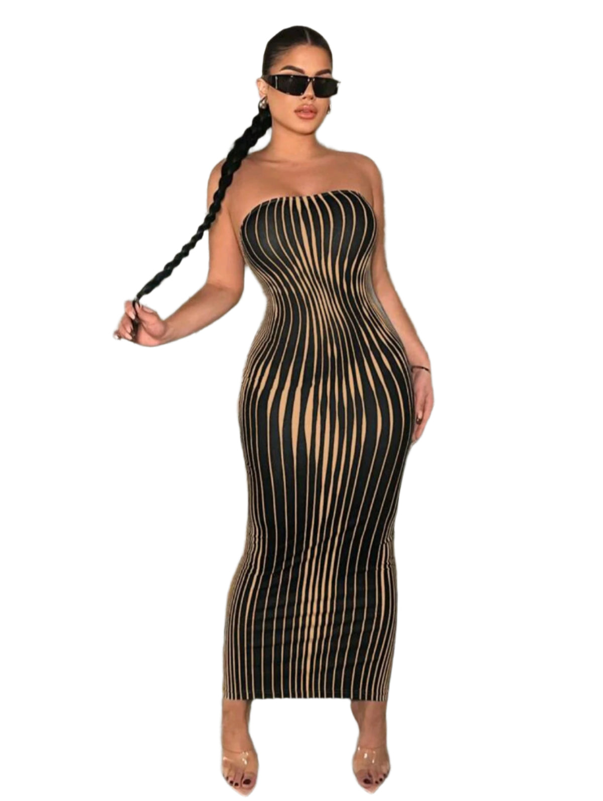 Címke nélküli, női testhezálló maxi ruha pánt nélküli kialakítással. Fekete és bézs színű optikai mintázatának köszönhetően karcsúsító hatású. Rugalmas, alakformáló anyagból készült, amely kiemeli az alakot. Elegáns és merész stílus esti programokra vagy különleges alkalmakra.