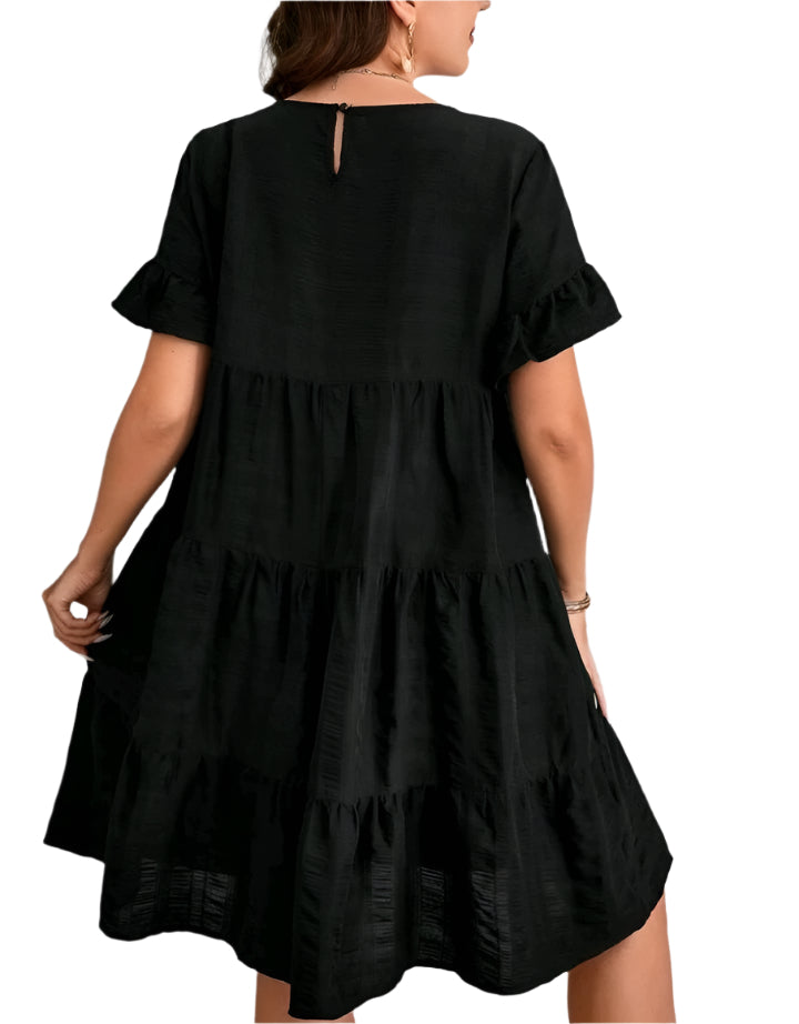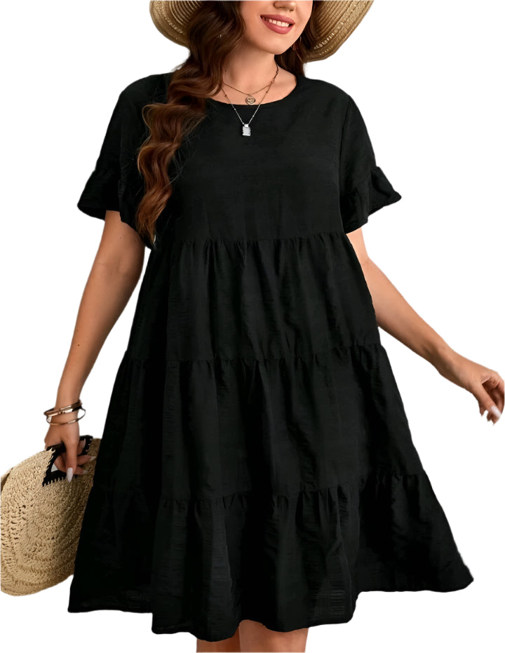 Címke nélküli, fekete bő fazonú nyári ruha. Légies, könnyed anyagból készült, rövid fodros ujjakkal és kerek nyakkivágással. A laza, réteges szabás kényelmes viseletet biztosít, így tökéletes választás hétköznapi viseletre, nyaralásokra vagy könnyedebb programokra.