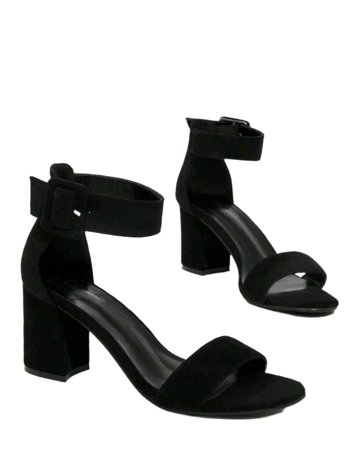 Címke nélküli, elegáns fekete szandál vastag, stabil sarokkal és széles elülső pánttal. Állítható bokapánttal rendelkezik, amely biztonságos és kényelmes viseletet biztosít. Klasszikus dizájnjának köszönhetően tökéletes választás alkalmi és elegáns öltözékekhez is.