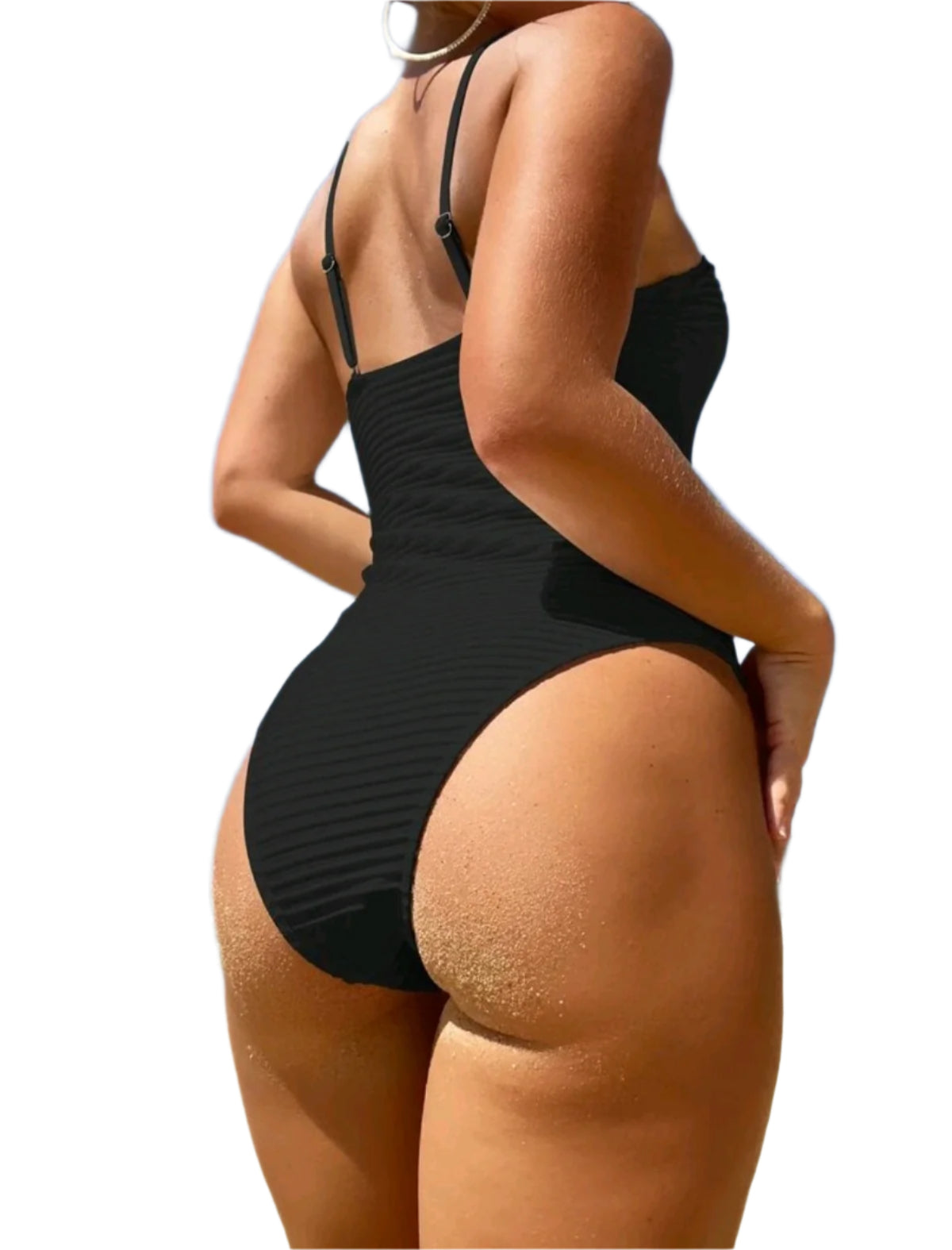 Címke nélküli, elegáns fekete színű, bordázott anyagú egyrészes fürdőruha. Vékony pántos kialakítása és letisztult szabása kiemeli a természetes formákat, miközben kényelmes viseletet biztosít. Ideális választás a tengerparti napozáshoz vagy a medencés kikapcsolódáshoz.
