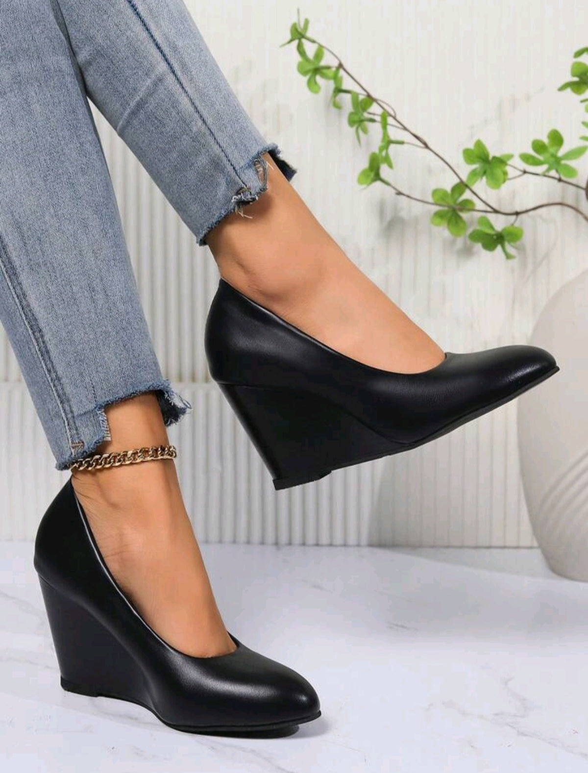 Címke nélküli, klasszikus fekete magassarkú cipő bőrhatású felülettel és kényelmes telitalppal. A zárt kialakítású fazon időtálló megjelenést biztosít, míg az ék sarok stabil és nőies viseletet kínál. Ideális választás irodai szettekhez, alkalmi ruhákhoz vagy elegáns hétköznapokra.