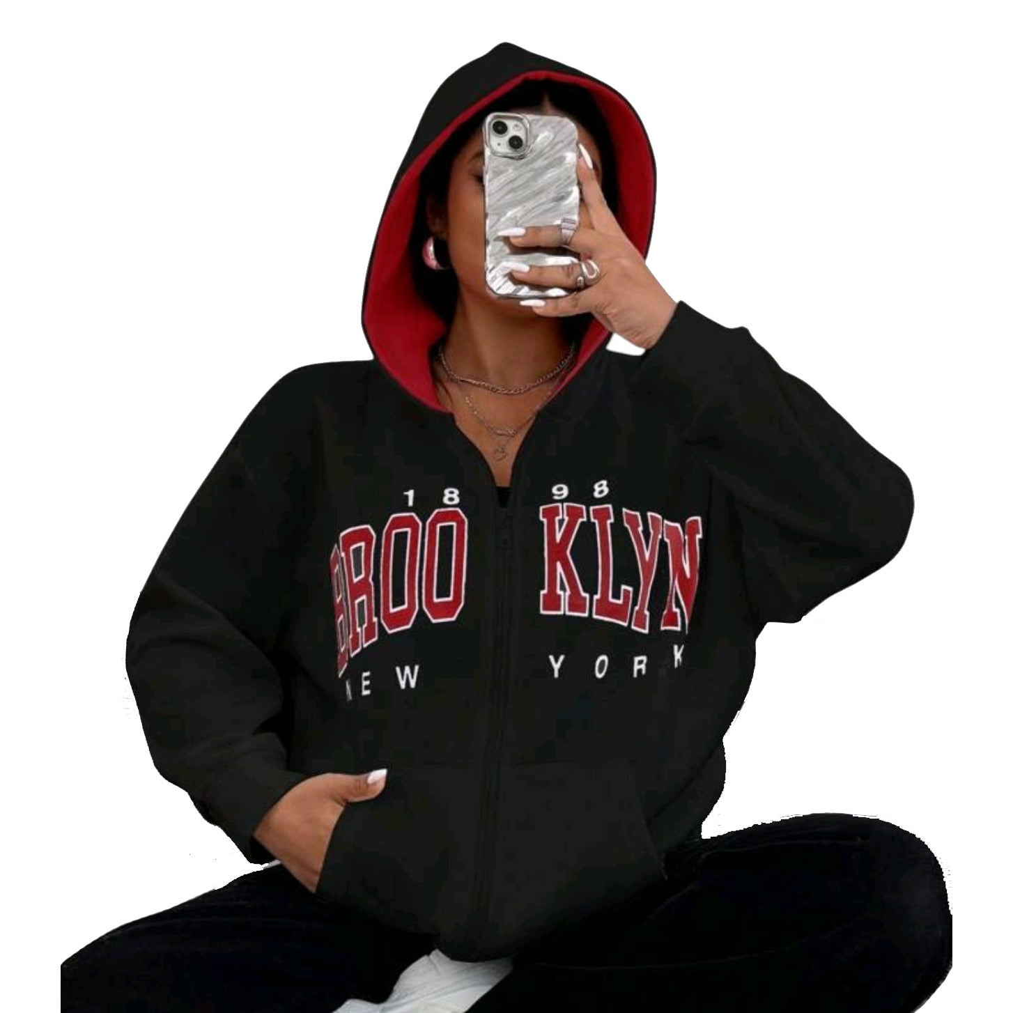 Címke nélküli, fekete, piros és fehér brooklyn felirattal, kapucnis, cipzáras.