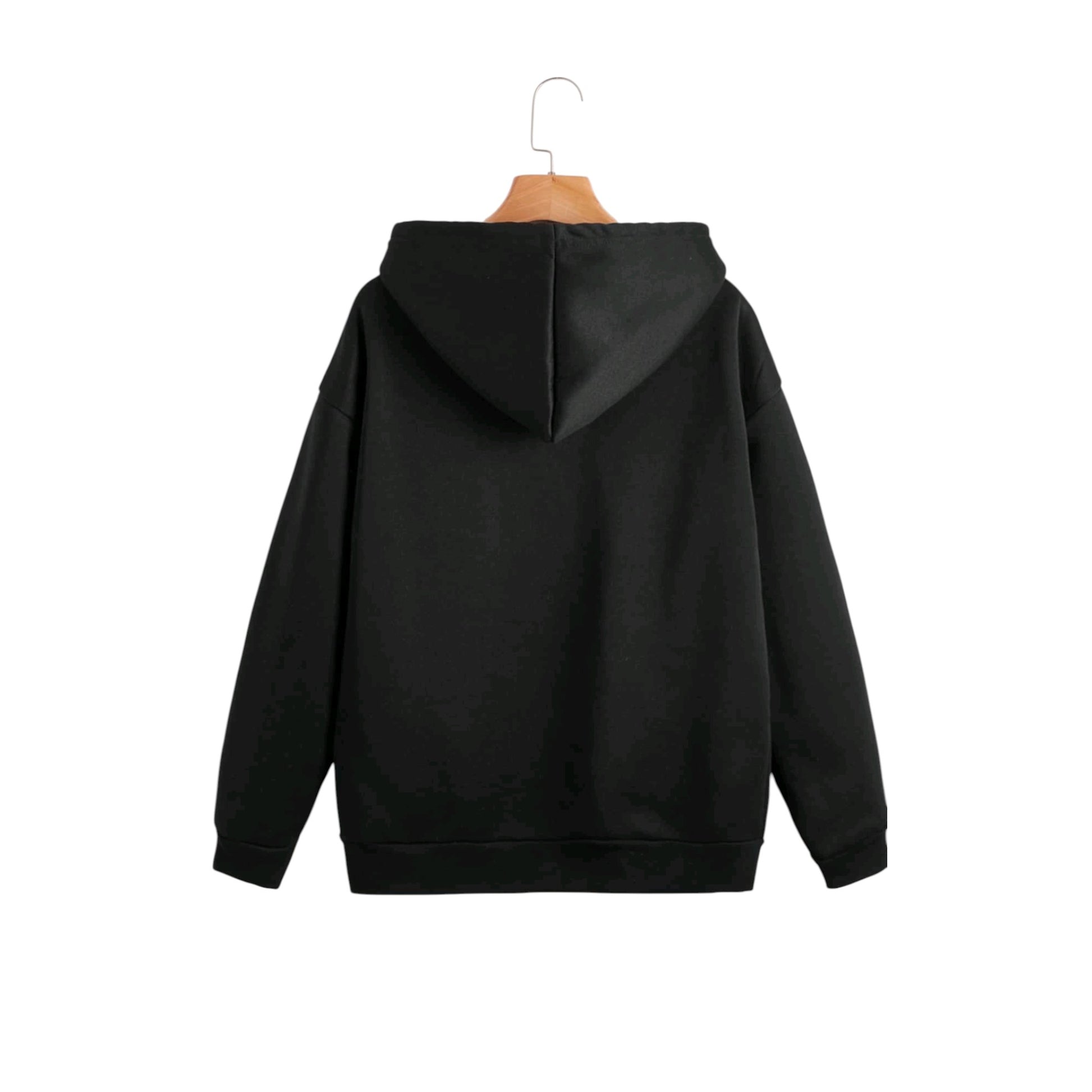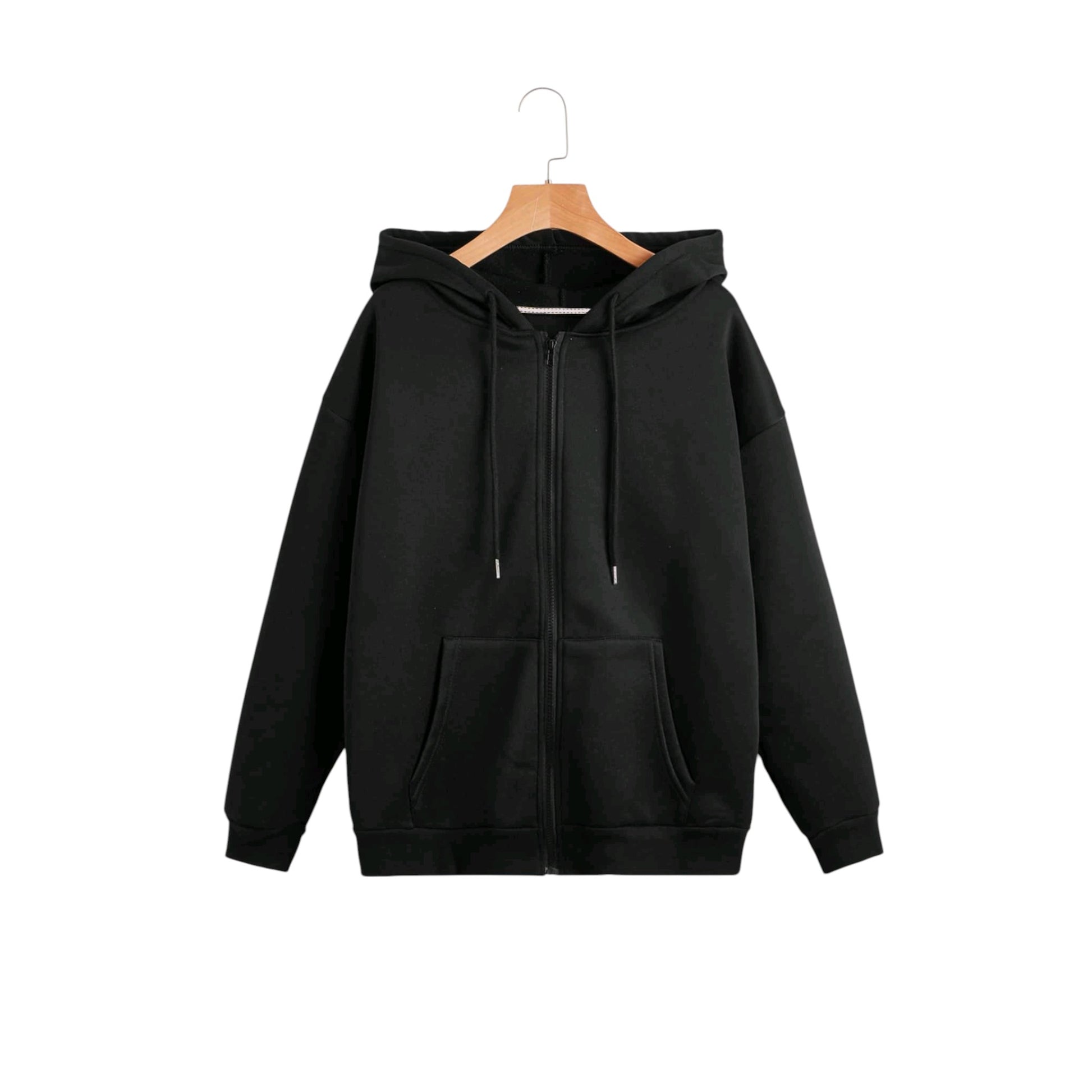 Címke nélküli, fekete, cipzáras, hosszú ujjú, kapucnis pulóver.