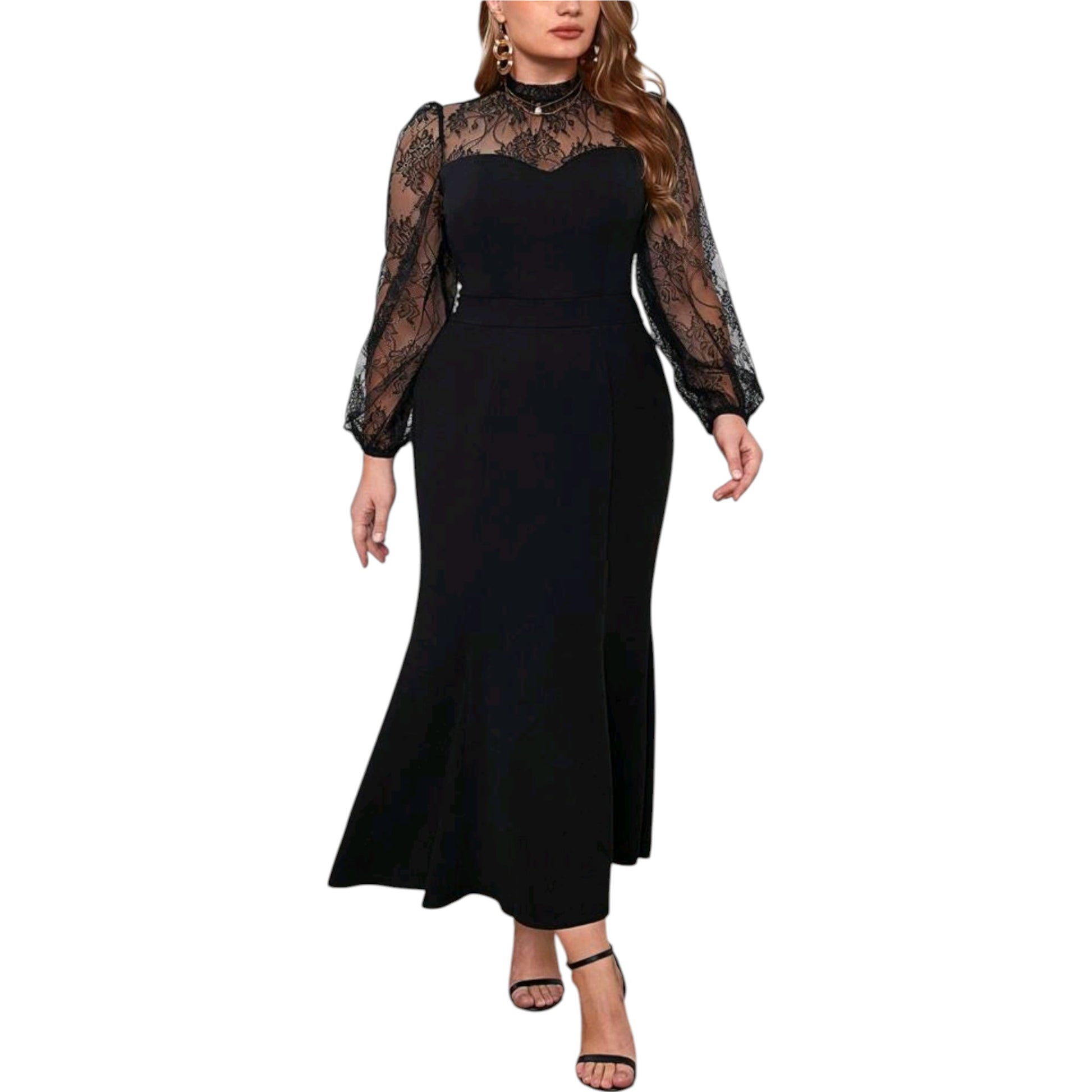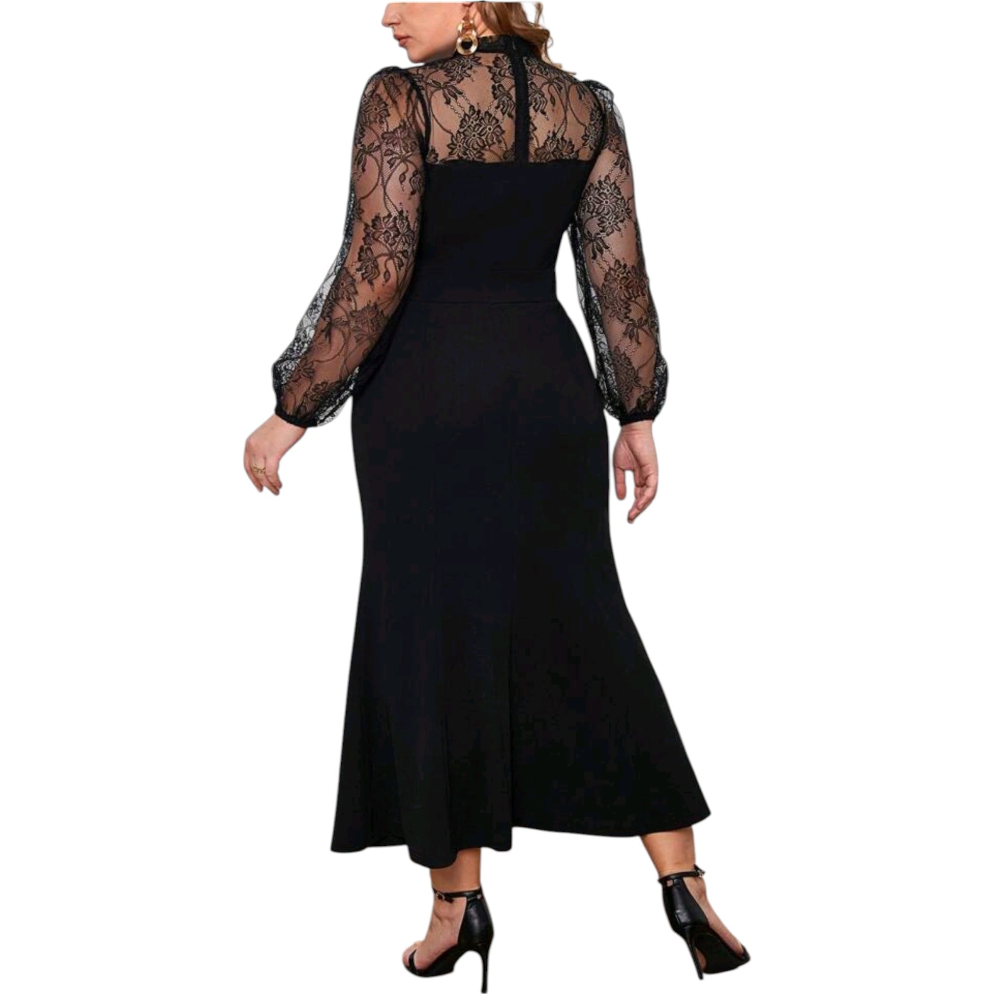 Címke nélküli, fekete, magas nyakú, hosszú csipke ujjú, maxi, testhezálló aljrésszel.