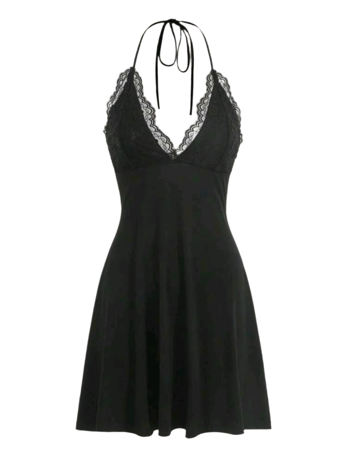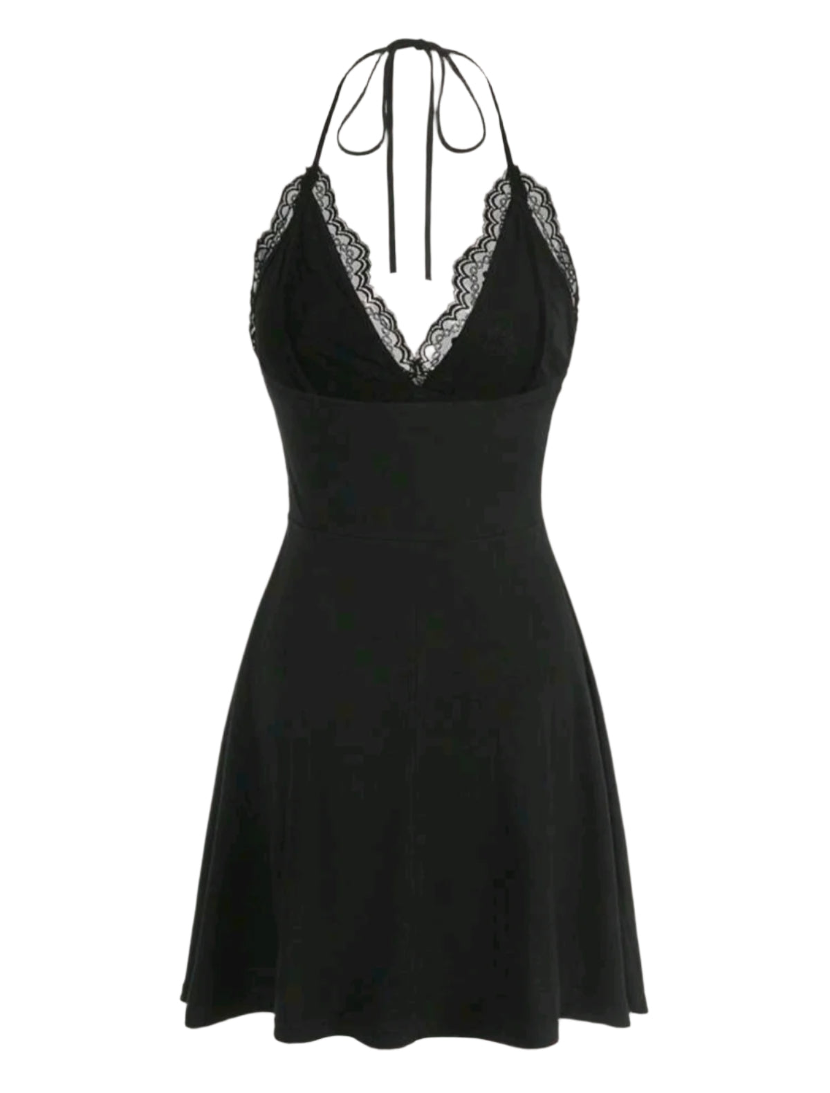 Címke nélküli, elegáns fekete ruha csipkés, mély V-kivágású felsőrésszel és nyakba köthető pántokkal. Az A-vonalú szabás könnyed és nőies megjelenést biztosít, míg a csipke részlet romantikus és kifinomult hatást kelt. Kényelmes, légies anyaga ideális választás különleges alkalmakra vagy esti programokra.