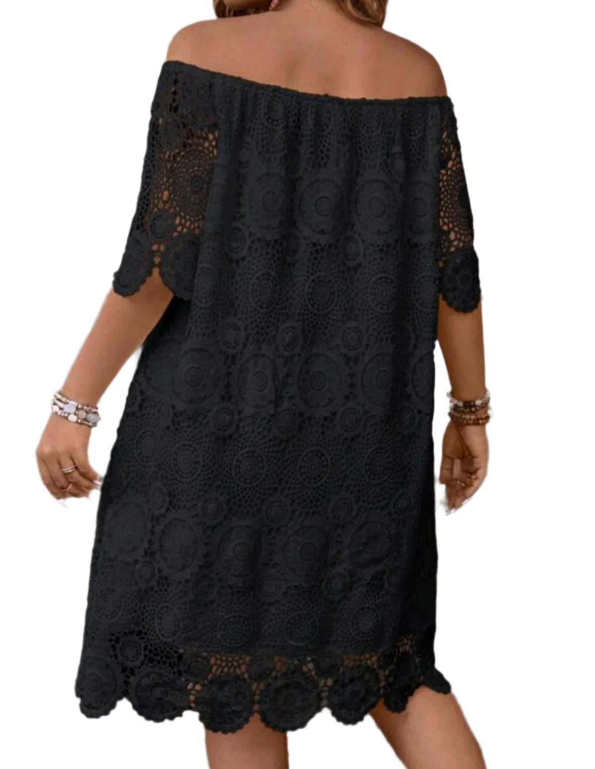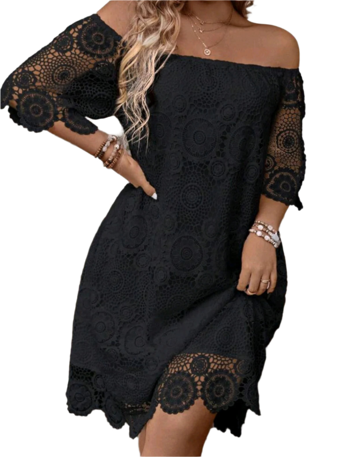 Címke nélküli, női elegáns ruha, fekete színű, váll nélküli kialakítással. Háromnegyedes, áttetsző csipkeujjakkal és finom csipke részletekkel az alsó szegélyen. Laza, A-vonalú fazon, romantikus és nőies megjelenés, tökéletes alkalmi, esti és nyári outfitekhez.